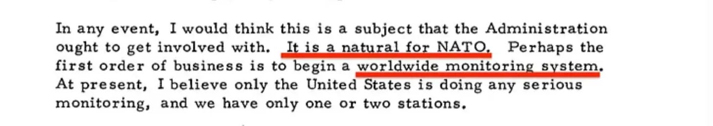 Και αυτό στη συνέχεια συνεπάγεται λογικά ότι όταν ο Kissinger έστειλε τον Russell Train στη Μόσχα στις αρχές του 1972 για να διαπραγματευτεί τη σύνταξη της συνθήκης του Μαΐου 1972 για την προστασία του περιβάλλοντος............... ο Train ήταν επίσης επικεφαλής του σχεδίου του ΝΑΤΟ που εργαζόταν για την παγκόσμια επιτήρηση για δηλωμένο σκοπό της προστασίας του περιβάλλοντος.
