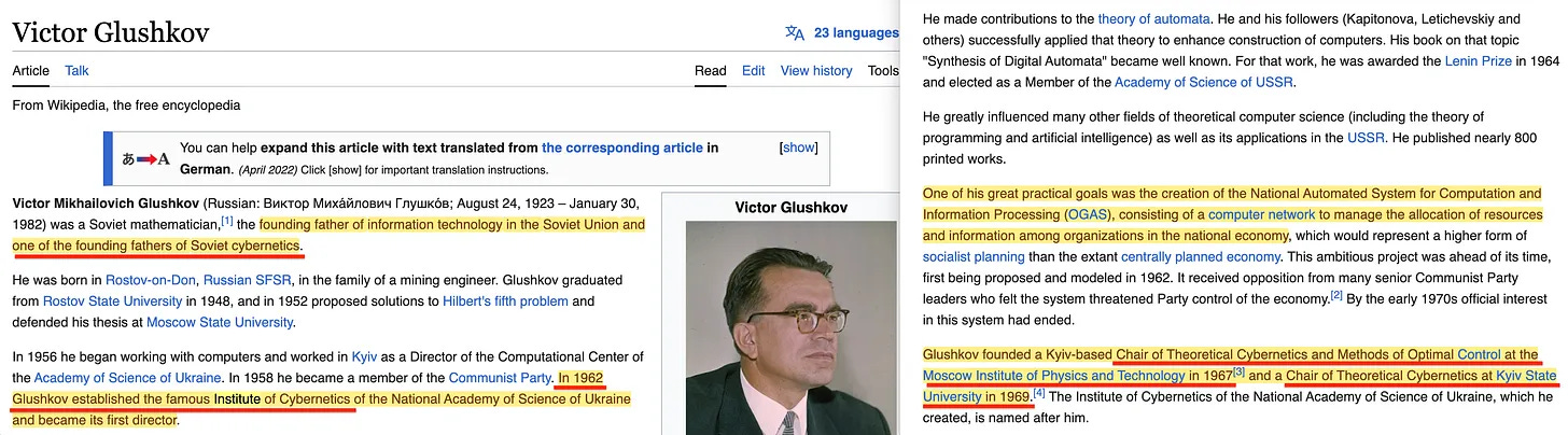 Η άνοδος της Σοβιετικής Κυβερνητικής [33] μπορεί τελικά να αναχθεί στο 1954, και στη μετέπειτα ώθηση [34] του Victor Glushkov στους επιστημονικούς κύκλους, η οποία συμπίπτει με την άνοδο του Alexei Kosygin στην πολιτική εξουσία [35], οδηγώντας στην ίδρυση του Ινστιτούτου Κυβερνητικής το 1962. Και η μεταρρύθμιση Kosygin του 1965 [36] προώθησε την ανάπτυξη και την εφαρμογή Αυτοματοποιημένων Συστημάτων Ελέγχου (ASU στα ρωσικά) για τη διαχείριση βιομηχανικών επιχειρήσεων και οικονομικών διαδικασιών. Τα συστήματα αυτά βασίζονταν σε κυβερνητικές αρχές και αποσκοπούσαν στη βελτιστοποίηση της παραγωγής, της κατανομής των πόρων και των διαδικασιών λήψης αποφάσεων μέσω της μηχανοργάνωσης και της αυτοματοποίησης.