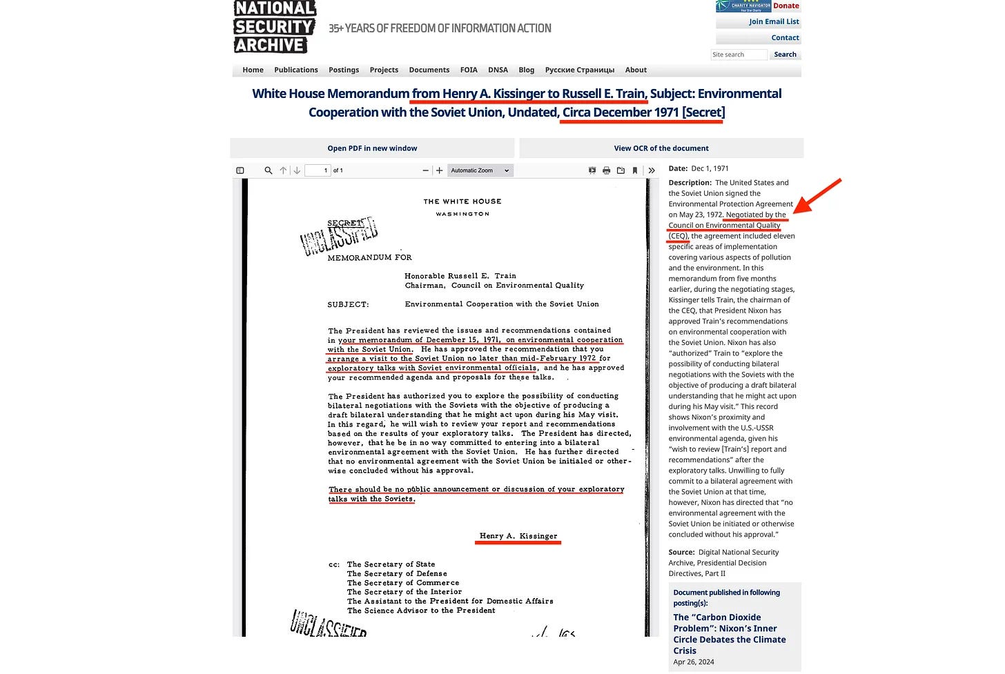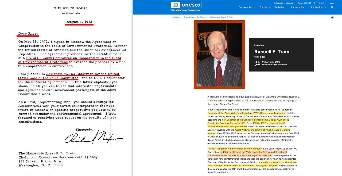 ... και αφήστε το στους απίστευτα χαζούς δημοσιογράφους των MSM [41] να παραλείψουν εντελώς το μάλλον κρίσιμο γεγονός ότι το Συμβούλιο για την Ποιότητα του Περιβάλλοντος υπό την ηγεσία του Russell E Train [42] , που δημιουργήθηκε μέσω της NEPA που επηρεάστηκε από το Ίδρυμα Διατήρησης, διαπραγματεύτηκε στην πραγματικότητα τη Συμφωνία για την Προστασία του Περιβάλλοντος του 1972 [43], με τον μοναδικό Henry Kissinger το 1971, ζητώντας από τον Russell E Train να ανέβει σε ένα αεροπλάνο για τη Μόσχα, το αργότερο τον Φεβρουάριο του 1972 για να συζητήσει αυτά τα θέματα.