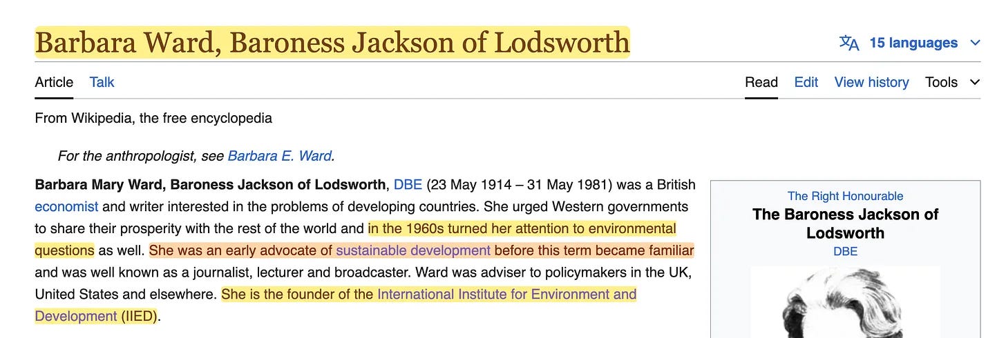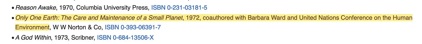 ... αλλά και συν-συγγραφέας του βιβλίου «Only One Earth» της UNCED του 1972, το οποίο ανέθεσε ο Maurice Strong, με την Barbara Ward, το όνομα της οποίας θα βρείτε επίσης να συνδέεται με το Spaceship Earth το 1966 (Γενική Θεωρία Συστημάτων), που πιστώνεται με την πρώιμη υποστήριξη της βιώσιμης ανάπτυξης (πριν αυτή ονομαστεί έτσι, και επίσης Γενική Θεωρία Συστημάτων), και στο διοικητικό συμβούλιο του Ιδρύματος Διατήρησης το 1976 [12].