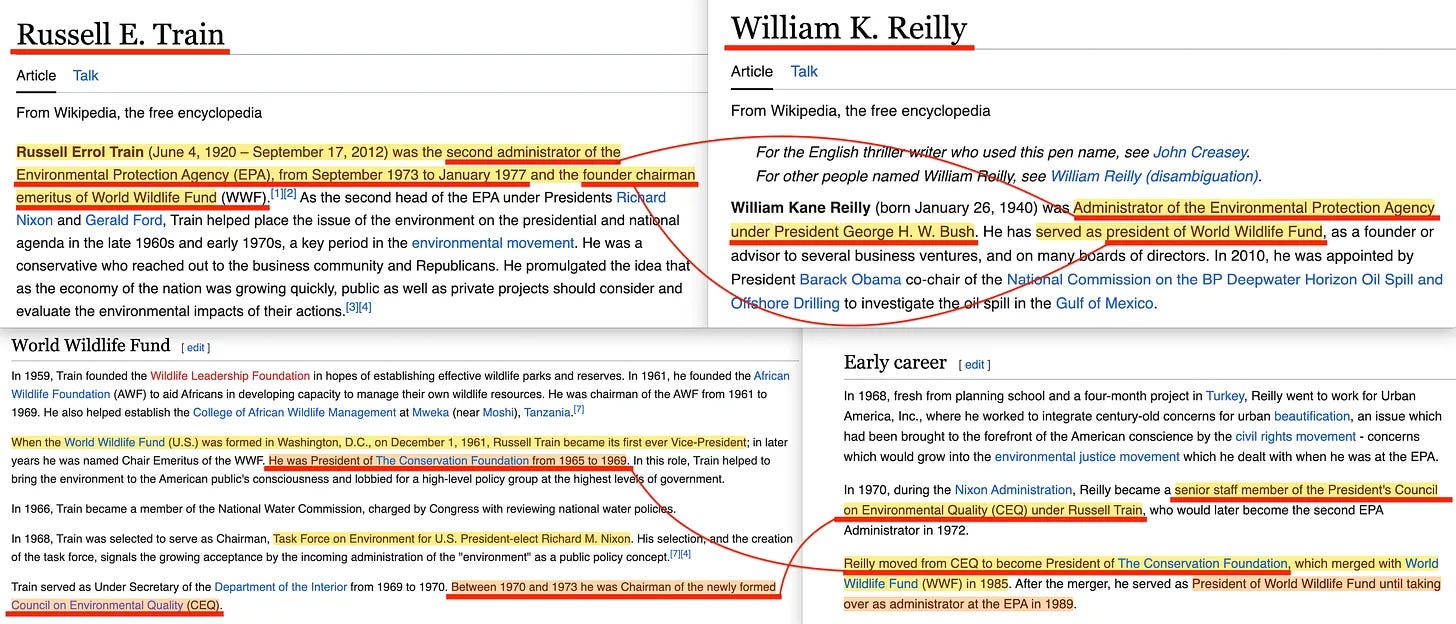 Παρεμπιπτόντως, ο Russell δεν ήταν ο μόνος άνθρωπος του Ιδρύματος Διατήρησης/CEQ/EPA/WWF που βρισκόταν στη σκηνή εκείνη την εποχή. Ο William K Reilly [44], ο οποίος υπηρέτησε υπό τον George HW Bush, ήταν ανώτερο στέλεχος του CEQ όταν ο Train ήταν επικεφαλής.