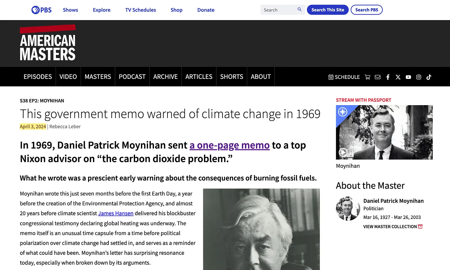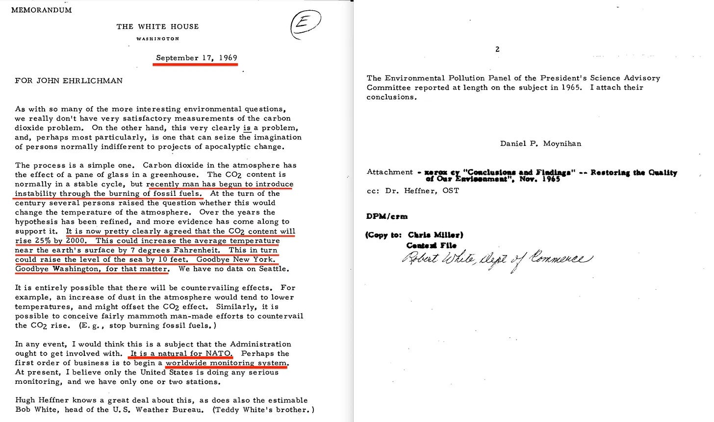 Ο Moynihan ήταν αυτός που στο παραπάνω δελτίο τύπου του 1969 ζήτησε από το ΝΑΤΟ να αναλάβει την παγκόσμια επιτήρηση. Και το παραπάνω αναφέρει ότι όταν παραιτήθηκε «μετά από ένα χρόνο περίπου», ο Russell Train έγινε ο επικεφαλής (το 1970) της υπηρεσίας του ΝΑΤΟ που του δόθηκε η αποστολή να -