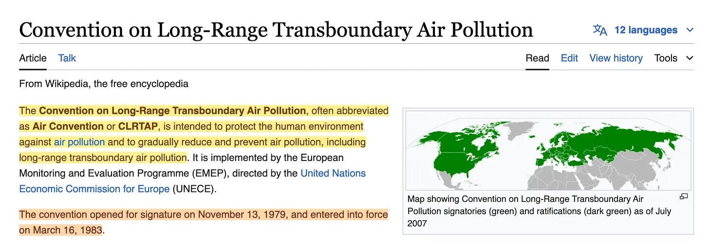 Η Σύμβαση για τη Διασυνοριακή Ρύπανση της Ατμόσφαιρας σε Μεγάλη Απόσταση άνοιξε για υπογραφή το 1979, αλλά τέθηκε σε ισχύ στις 16 Μαρτίου 1983 [37].