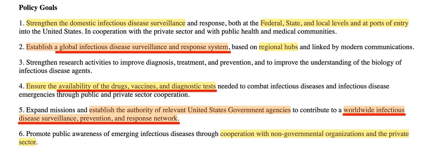 Όσον αφορά το θέμα της επιτήρησης, η πρωτοβουλία που ανακοίνωσε ο Κλίντον πέρασε από το Υπουργείο Άμυνας, το οποίο το 1997 ανακοίνωσε το έργο του «Global Emerging Infectious Surveillance», το οποίο μέσω της επικαιροποίησής του για το 2023 περιέγραφε την παρούσα κατάσταση των δυνατοτήτων του και τους μακροπρόθεσμους στόχους του - χρησιμοποιώντας μια προσέγγιση «One Health (Ενιαία Υγεία) Approach» - η οποία επιδιώκει την επιτήρηση της κλιματικής αλλαγής και της αστικοποίησης, και...