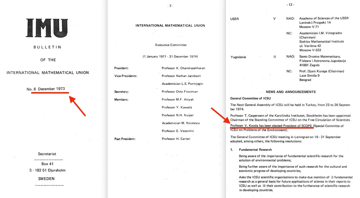 Στη συνέχεια, ο σύνδεσμος Viktor Kovda είναι σημαντικός. Διότι υπάρχει ακριβώς 0% πιθανότητα να μην γνώριζε για το Παγκόσμιο Σύστημα Παρακολούθησης Περιβάλλοντος, κάτι που προφανώς θα συνεπαγόταν ότι το γνώριζαν και οι κορυφαίοι γραφειοκράτες της Σοβιετικής Ένωσης. Ιδιαίτερα δεδομένου ότι ο ίδιος - το 1971 - ασχολήθηκε με το Γραφείο SCOPE της ICSU - κατά τα στάδια σχεδιασμού του Παγκόσμιου Συστήματος Παρακολούθησης [39].