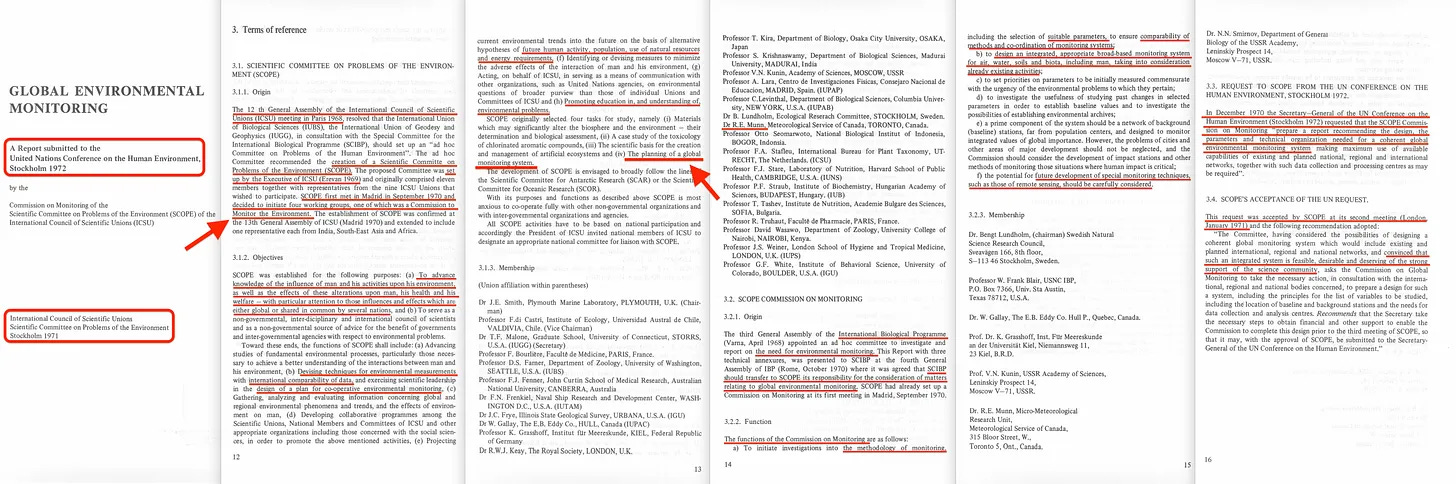 Τυχαίνει να ιδρύθηκε η SCOPE από την ICSU το 1969, και η πρώτη της έκθεση από το 1971 - ένα έγγραφο εισόδου για την UNCED του 1972, που ανατέθηκε από... ναι τον Maurice Strong - αφορούσε την Παγκόσμια Περιβαλλοντική Παρακολούθηση. Και μια έκθεση παρακολούθησης μετά τη διάσκεψη ήταν ανάθεση. Αυτή έγινε το SCOPE 3 που κυκλοφόρησε το 1973, με άλλο τίτλο - Παγκόσμιο Σύστημα Παρακολούθησης του Περιβάλλοντος.