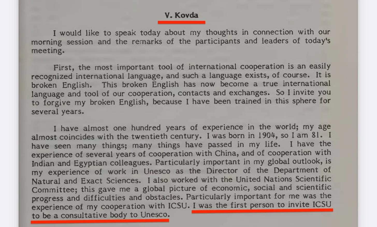 Ο Dr V.A. Kovda της Σοβιετικής Ένωσης είναι ο Victor Kovda. Αυτός εξασφάλισε από νωρίς την πρόσκληση της ICSU στην UNESCO.