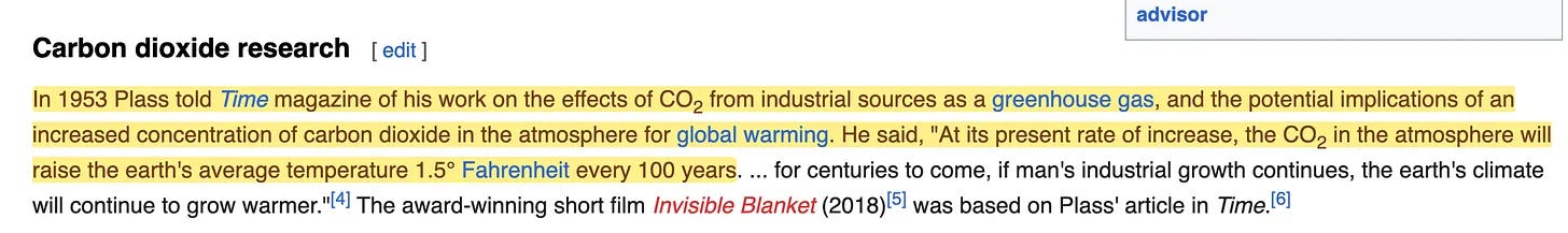 1953. Ο Gilbert Plass μιλάει στο περιοδικό Time για τη θεωρία του περί κινδυνολογίας για το διοξείδιο του άνθρακα.