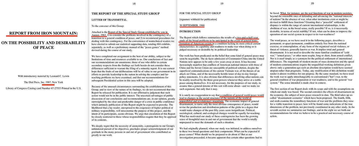 1967. Η Έκθεση από το Iron Mountain για χάρη της συνεχούς εξουσίας των ελίτ προτείνει τη μετατόπιση της εστίασης από τον πόλεμο στο περιβάλλον.