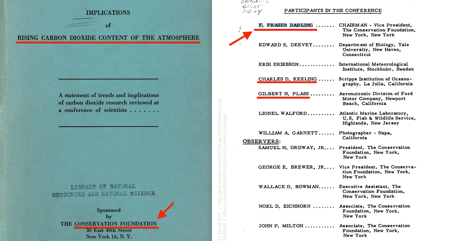 Ο Fraser Darling προήδρευσε επίσης της συνάντησης του 1963 [13] , η οποία οδήγησε στην πρώτη, γελοία «συναίνεση για τον άνθρακα»: «Αύξηση της περιεκτικότητας της ατμόσφαιρας σε διοξείδιο του άνθρακα» - την οποία σας παρουσίασε το Ίδρυμα Διατήρησης που χρηματοδοτείται από τον Rockefeller, όπως αναφέρεται παραπάνω.