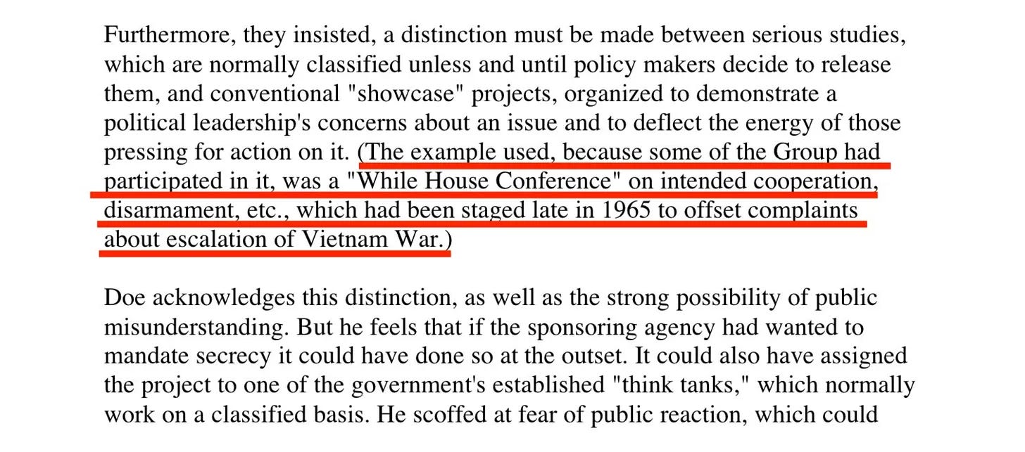Το πρώτο από μερικά σημεία που δεν εξετάστηκαν νωρίτερα - η Διάσκεψη του Λευκού Οίκου για τη Διεθνή Συνεργασία του 1965 - έμαθα για το γεγονός αυτό μόνο μέσω... της Έκθεσης από το Iron Mountain [38] - όχι, πραγματικά - η οποία επιπλέον καλούσε την εν λόγω διάσκεψη ως ένα στημένο γεγονός.