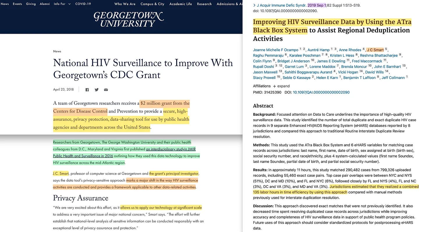 Ξόδεψα πολύ χρόνο για να βρω όλες αυτές τις πληροφορίες. ΠΟΛΥ χρόνο. Και για να είμαι ειλικρινής, ήταν καθαρτικό να βρω το παραπάνω δελτίο τύπου του 1969 του Moynihan. Επειδή έβαλε το ΝΑΤΟ, και συνεπώς το Υπουργείο Άμυνας στην εξίσωση. Και ο ρόλος του στρατού μέσω της απάτης ήταν πάντα... υπονοούμενος, αλλά όχι άμεσα συνδεδεμένος. Βέβαια, μπορείς να δείξεις τις επιχορηγήσεις, αλλά αυτά τα επιχειρήματα είναι γενικά εύκολο να αποκρουστούν, επειδή υπάρχουν πολλές επιχορηγήσεις. Ένα άλλο παράδειγμα έμμεσης εμπλοκής είναι μέσω του προγράμματος Παγκόσμιας Επιτήρησης του Georgetown, στο οποίο συνέβαλε ο Peter Piot ενώ βρισκόταν στο νεκροκρέβατο του αυτοαποκαλούμενου «Covid-19» στις αρχές της «πανδημίας». Και αυτό παρασύρει και το AvesTerra, το οποίο παρεμπιπτόντως αναπτύχθηκε για να παρακολουθεί την... επιτήρηση του HIV. Στην πραγματικότητα, έλαβαν μια επιχορήγηση ύψους 2 εκατομμυρίων δολαρίων, ευγενική χορηγία του CDC το 2018, και την παραμονή της απάτης-πανδημίας, ο επικεφαλής αρχιτέκτονας του AvesTerra συν-συγγραφέας ενός σχετικού εγγράφου.