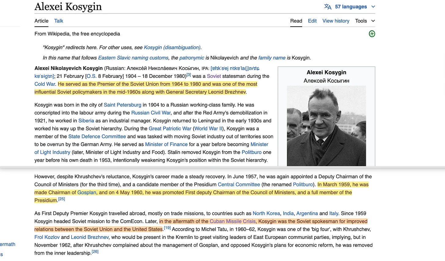 Ο Kosygin, περαιτέρω, «μετά την κρίση των πυραύλων της Κούβας, ο Kosygin ήταν ο σοβιετικός εκπρόσωπος για τη βελτίωση των σχέσεων μεταξύ της Σοβιετικής Ένωσης και των Ηνωμένων Πολιτειών».