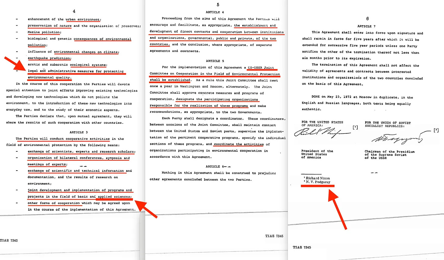 Το έγγραφο συνεχίζει, ζητώντας «τη δημιουργία και την ανάπτυξη άμεσων επαφών και συνεργασίας μεταξύ ιδρυμάτων και οργανισμών, κυβερνητικών, δημόσιων και ιδιωτικών...». Και το άρθρο 5 ζητά τη σύσταση μιας Μεικτής Επιτροπής ΗΠΑ-ΕΣΣΔ για τη συνεργασία στον τομέα της προστασίας του περιβάλλοντος, επιδιώκοντας τον συντονισμό των υποθέσεων. Και το έγγραφο αυτό υπογράφηκε από τον Richard Nixon, τον «συντηρητικό».