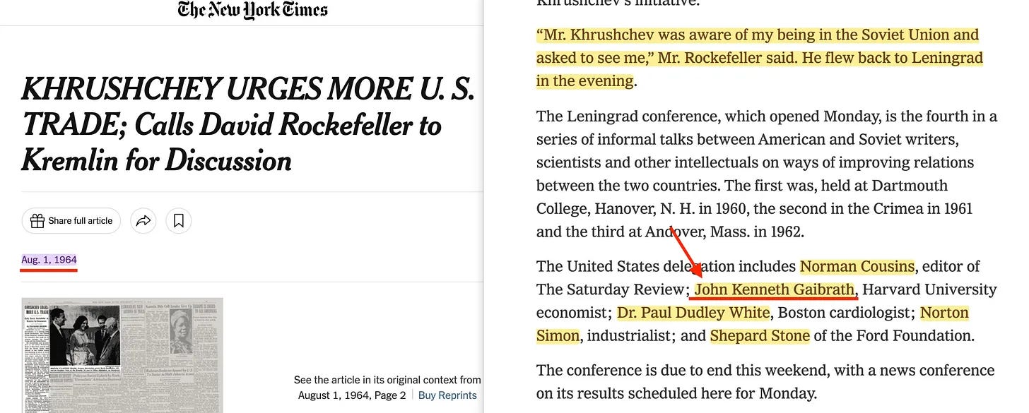 Το 1964, κατά τη διάρκεια της Τέταρτης Διάσκεψης του Dartmouth στο Leningrad, ο David Rockefeller πήγε στη Μόσχα, δήθεν για να συζητήσει το εμπόριο με τον Khrushchev [40]. Αυτό το ταξίδι αφορούσε πραγματικά το εμπόριο; Και γιατί ο John Kenneth Galbraith - ο μόνος αναγνωρισμένος συνεργάτης της έκθεσης Report on Iron Mountain - συμπεριλήφθηκε ως εκπρόσωπος στη διάσκεψη;