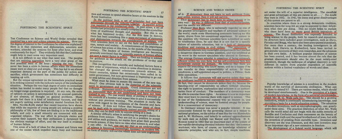Η επιστήμη ανακηρύσσεται κομβικής σημασίας για τη νίκη στον πόλεμο κατά του Χίτλερ και για το σκοπό αυτό οι επιστήμονες πρέπει να ενωθούν στον αγώνα κατά της ναζιστικής Γερμανίας. Επιπλέον, η επιστήμη πρέπει να ασκεί αμεσότερη επιρροή στην πολιτική, καθώς «δεν μπορεί να αναμένεται από τους πολιτικούς να χρησιμοποιούν με αποτελεσματικότητα ένα όργανο που δεν κατανοούν». Στην πραγματικότητα, «αν η δημοκρατία δεν μάθει να αναζητά καθοδήγηση από την επιστήμη και να τη χρησιμοποιεί, τότε δεν θα επιβιώσει».