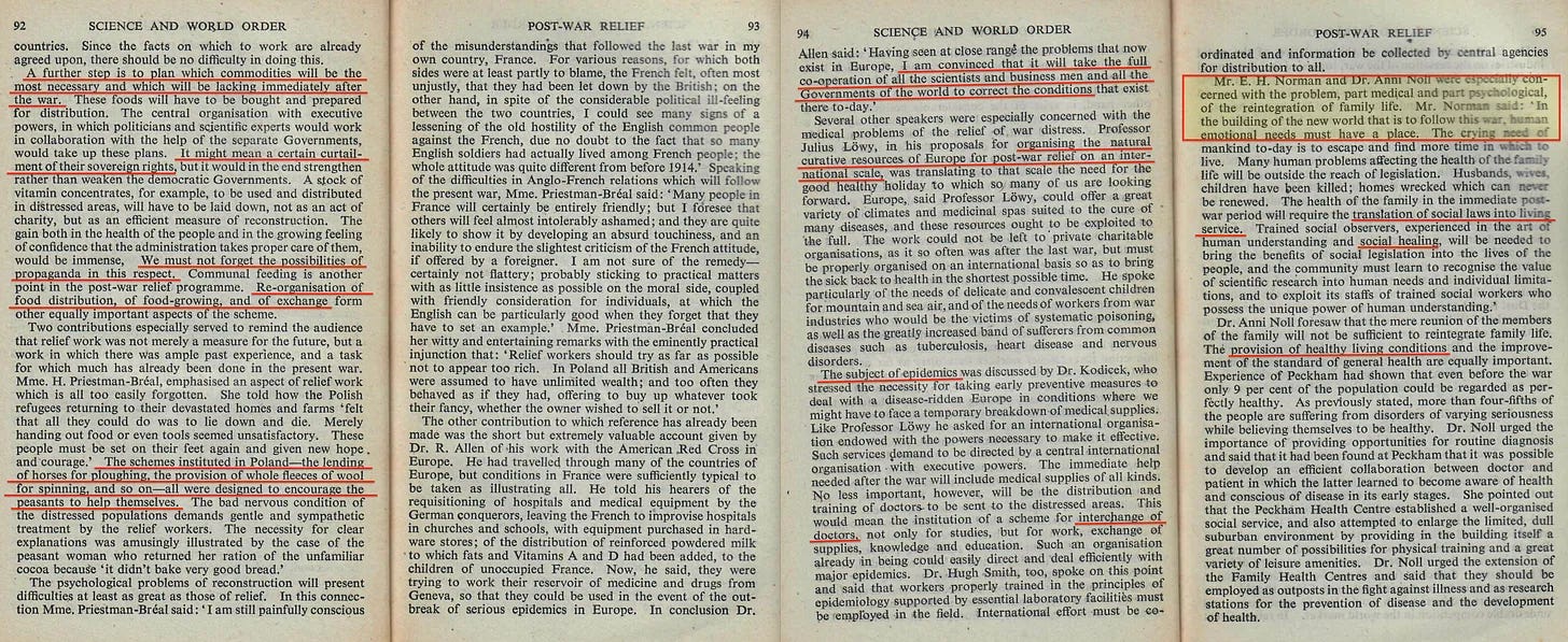«Ο κ. EH Norman και ο Dr. Noll ασχολήθηκαν ιδιαίτερα με το πρόβλημα, εν μέρει ιατρικό και εν μέρει ψυχολογικό, της επανένταξης της οικογενειακής ζωής. Ο κ. Norman είπε: « στην οικοδόμηση του νέου κόσμου που θα ακολουθήσει αυτόν τον πόλεμο, οι ανθρώπινες συναισθηματικές ανάγκες πρέπει να έχουν θέση» .