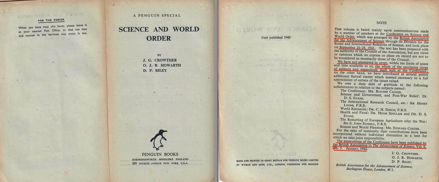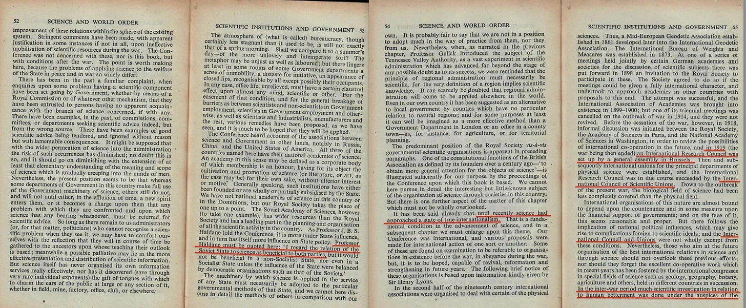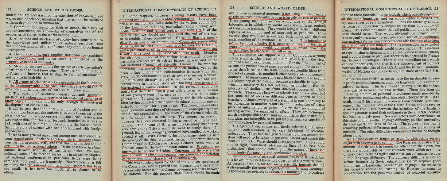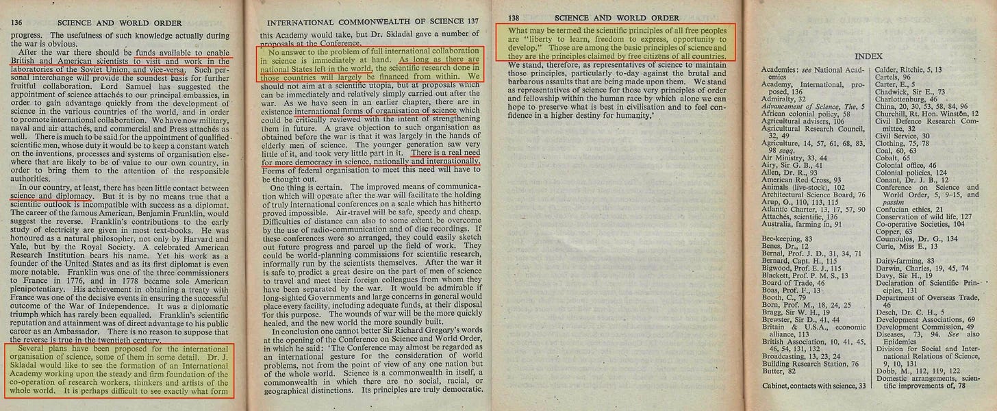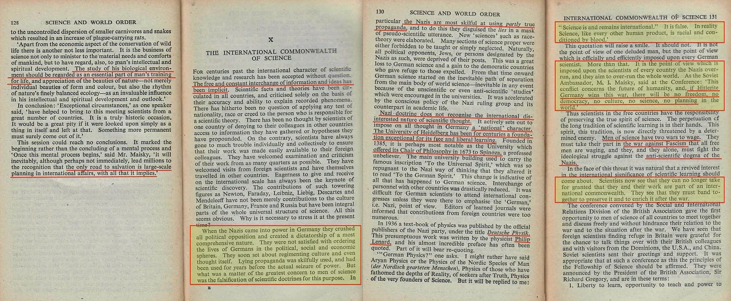 «Ίσως η σημαντικότερη εκδήλωση που διοργάνωσαν αυτού του είδους ήταν το συνέδριο του 1941 για την Επιστήμη και την Παγκόσμια Τάξη, που πραγματοποιήθηκε στο Λονδίνο. Οι επιδοκιμασίες του σοβιετικού κομμουνισμού και ο ρόλος των νέων επιστημόνων στη διάδοση του μηνύματος του επιστημονικού σοσιαλισμού τύπου ΕΣΣΔ και της αξιοποίησης της επιστήμης για τον πόλεμο ήταν τόσο αχαλίνωτες που πολλοί σύνεδροι... το κατήγγειλαν ως μια απλή πολιτική εκδήλωση για τη συσπείρωση της μορφωμένης νεολαίας της Βρετανίας στην υπόθεση του κομμουνισμού.»