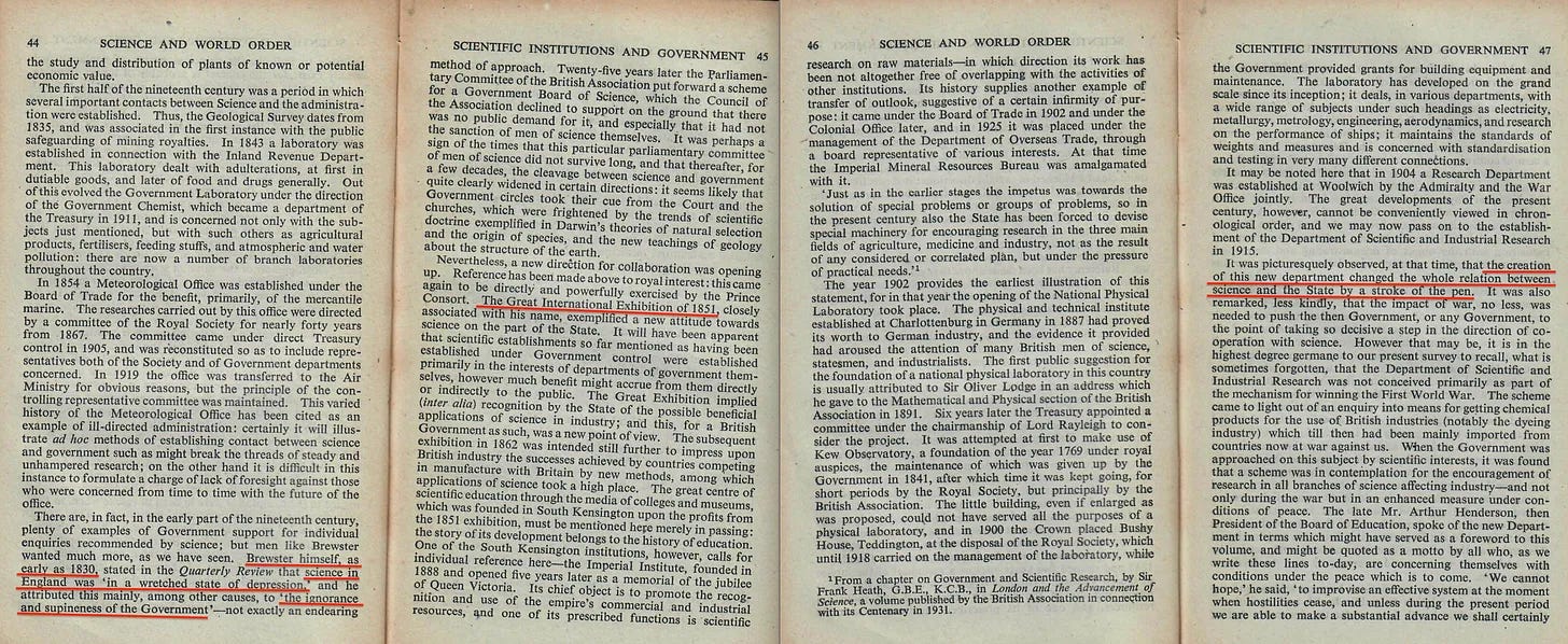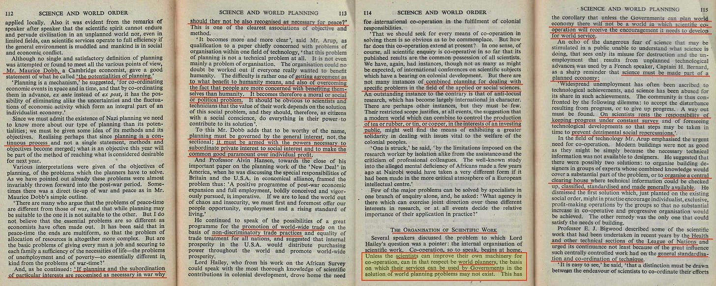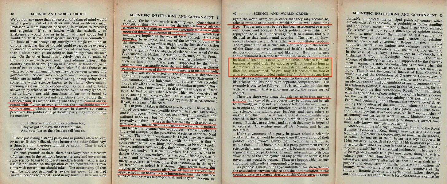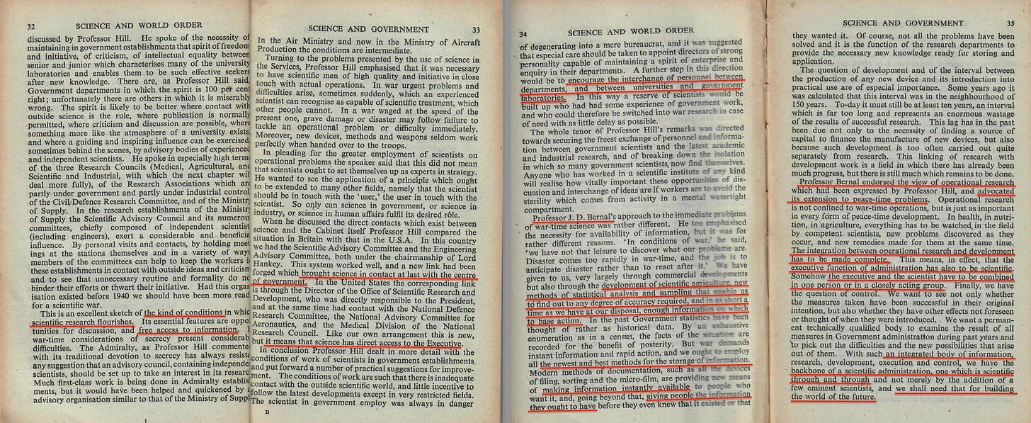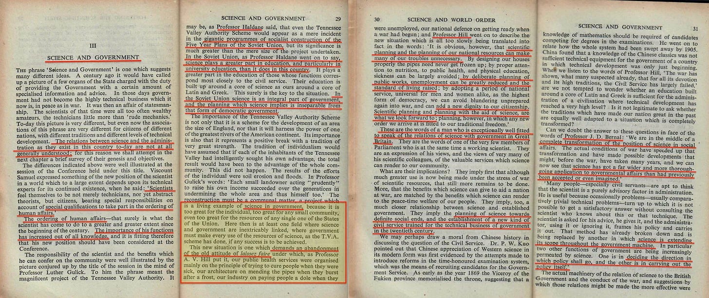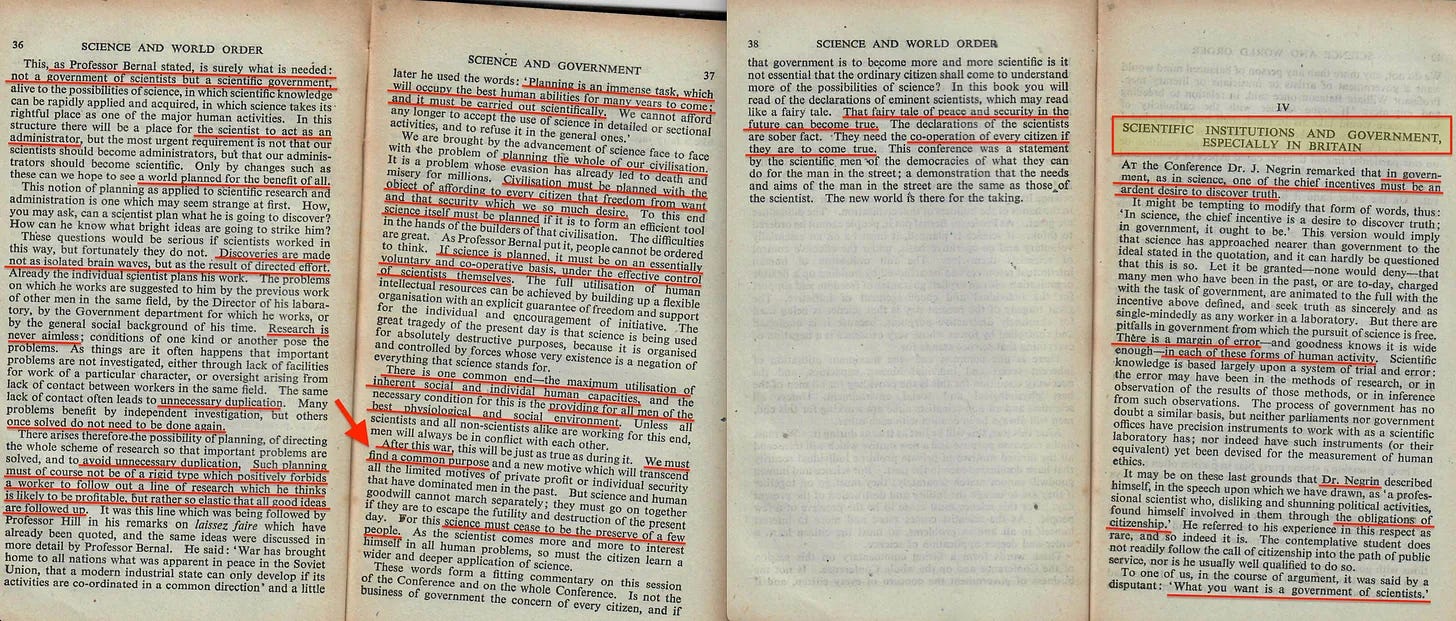 «Καθηγητής J. D. Bernal: «Βρισκόμαστε στη μέση μιας πλήρους μεταμόρφωσης της θέσης της επιστήμης στην κοινωνική υπόθεση... η επιστήμη έχει πολύ ευρύτερη και πιο εμπεριστατωμένη εφαρμογή στις κυβερνητικές υποθέσεις από ό,τι είχε προηγουμένως τονιστεί ή ακόμη και φανταστεί».