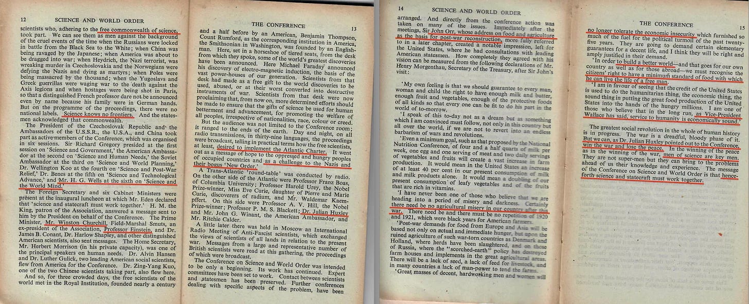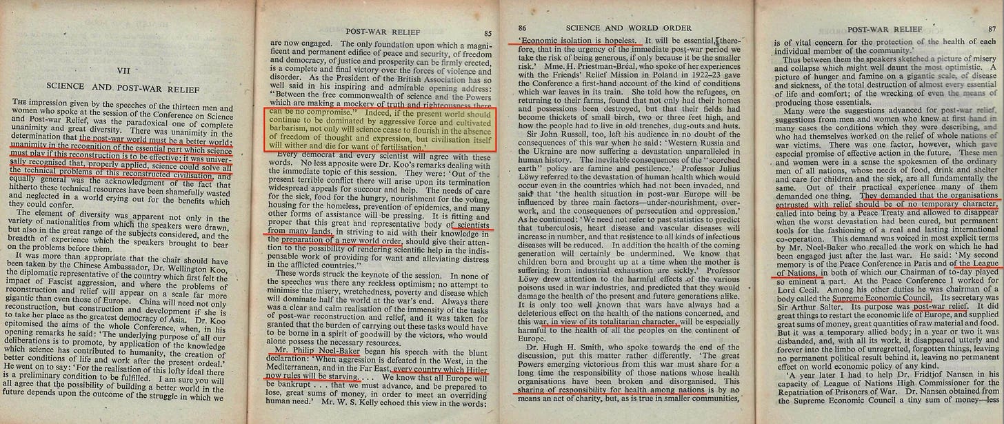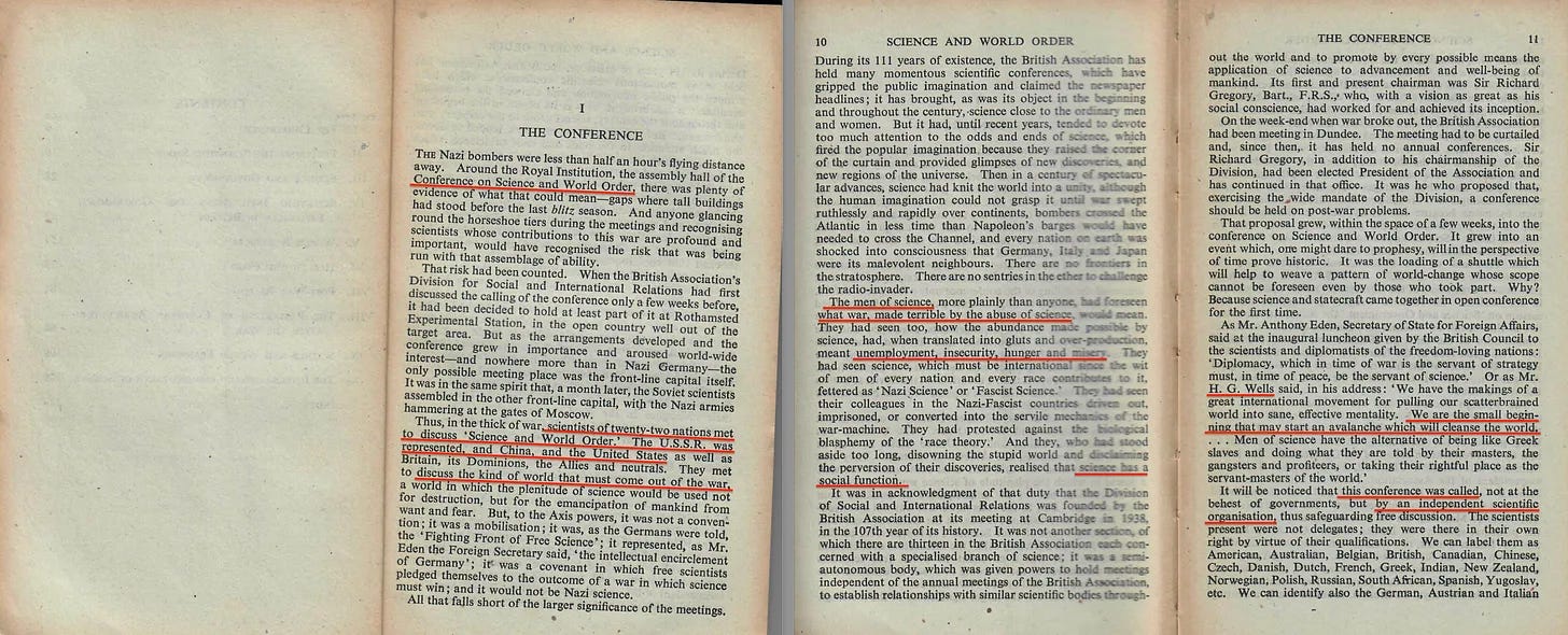 Στο συνέδριο συμμετείχαν 22 έθνη, συμπεριλαμβανομένης της Σοβιετικής Ένωσης, και το θέμα της συζήτησης ήταν «το είδος του κόσμου που πρέπει να βγει από τον πόλεμο». Για το σκοπό αυτό, η επιστήμη θεωρήθηκε ότι έπαιζε έναν όλο και πιο σημαντικό ρόλο - έναν ρόλο που, σύμφωνα με τον H.G. Wells, γινόταν χιονοστιβάδα. Ο Wells, βέβαια, ήταν σοσιαλιστής της Fabian, όπως και ο Leonard S. Woolf, ο οποίος έγραψε τη Διεθνή Διακυβέρνηση, οπότε δεν μπορώ να πω ότι τρέμω από ενθουσιασμό σε αυτό το στάδιο.