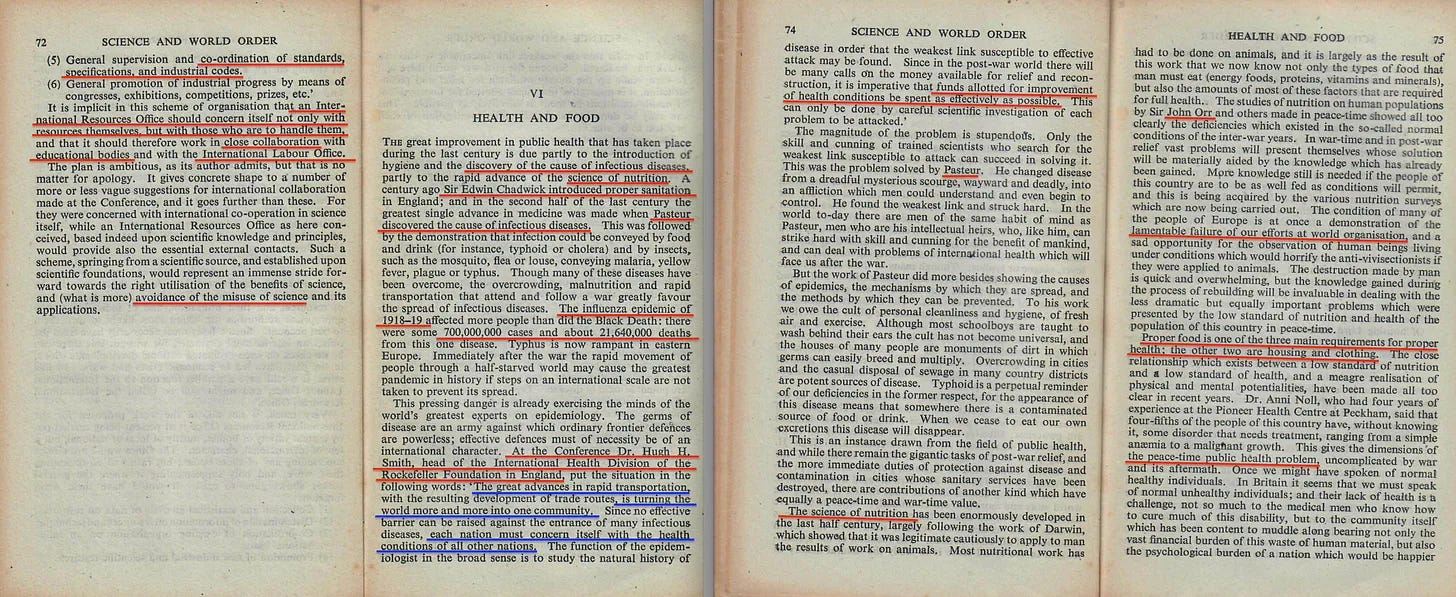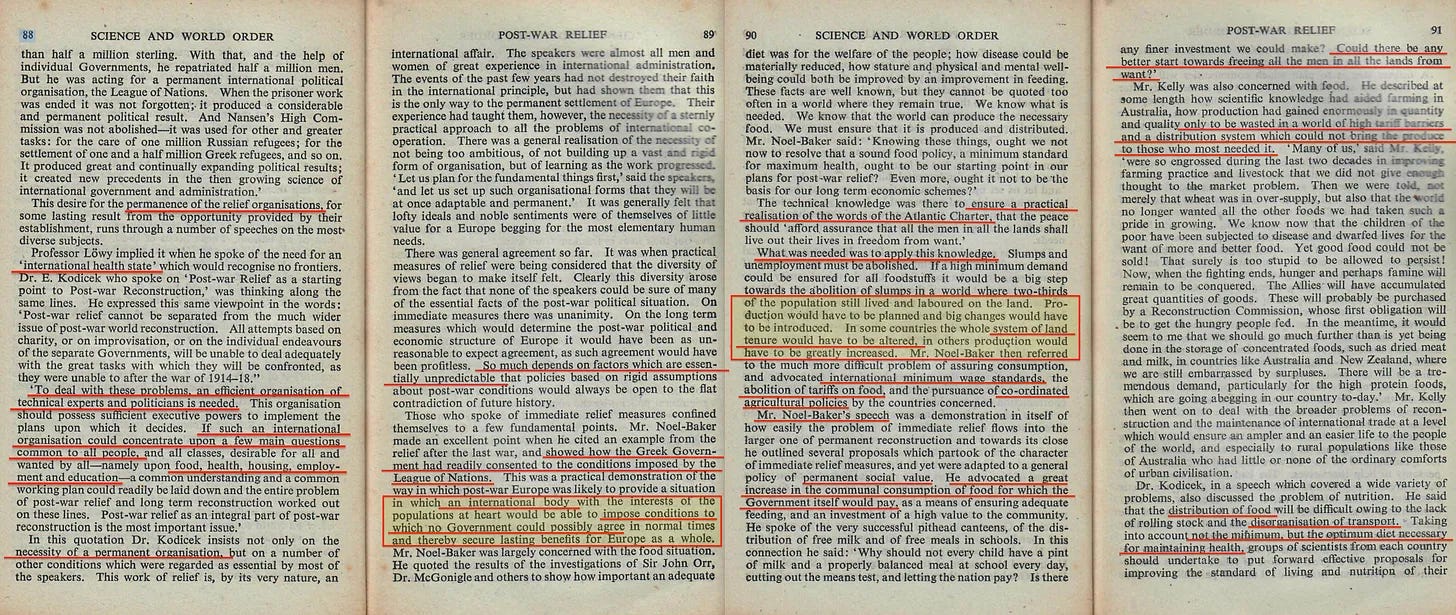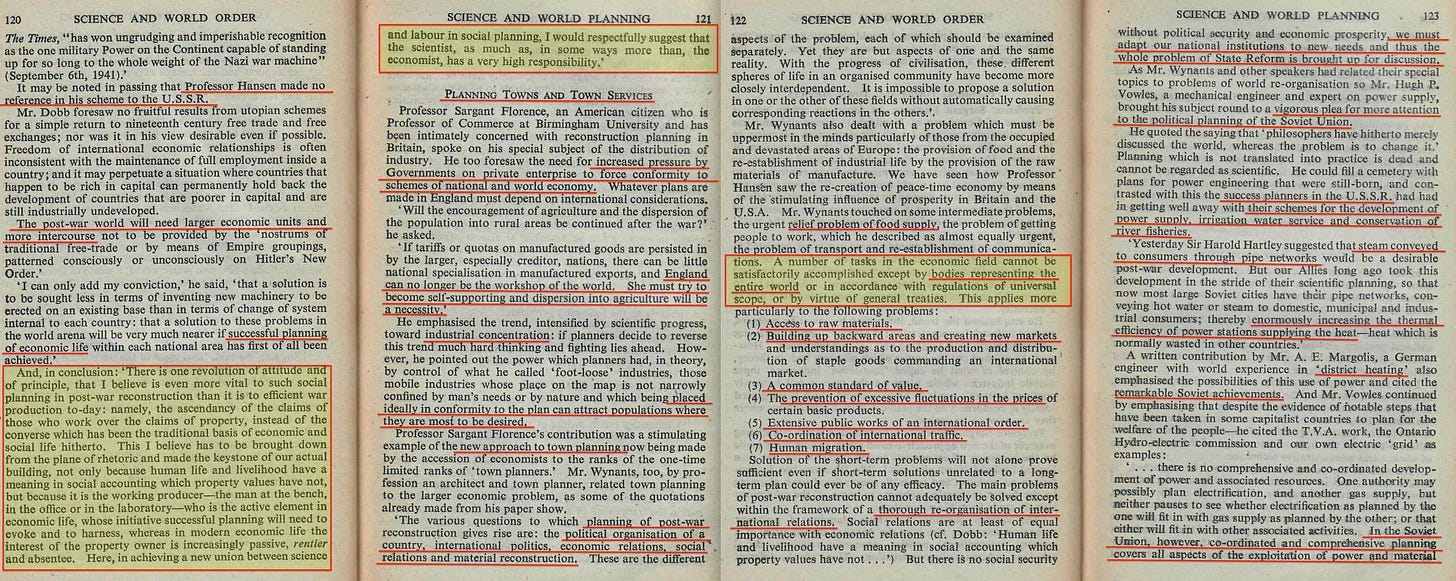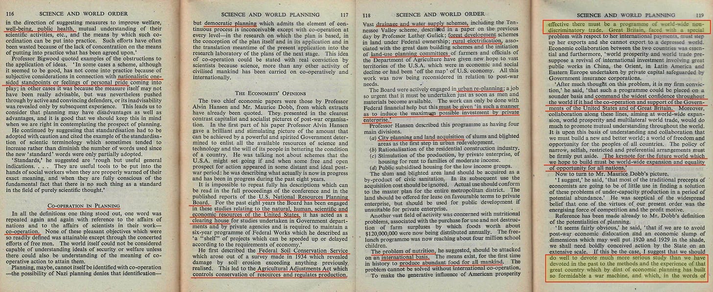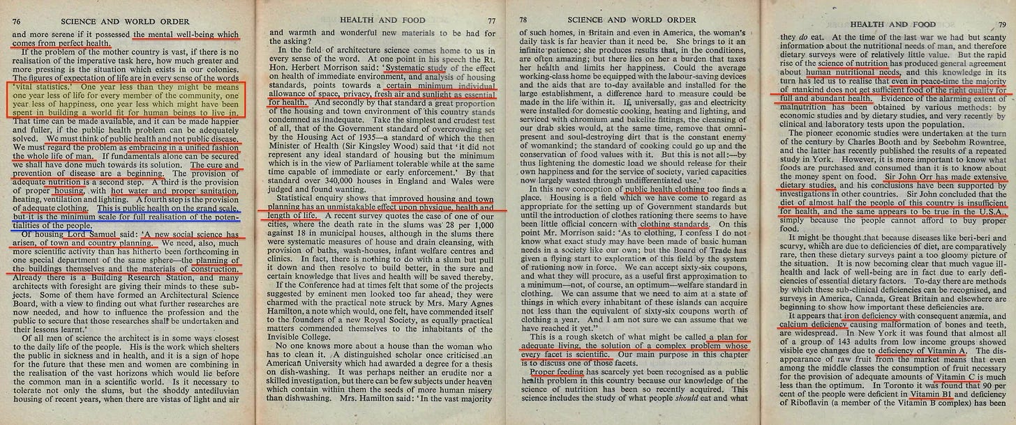 «Είναι προφανές, ωστόσο, ότι ο επιστημονικός σχεδιασμός και ο προγραμματισμός των εθνικών μας πόρων μπορούν να καταστήσουν πολλά από τα προβλήματά μας περιττά. Σχεδιάζοντας σωστά τα σπίτια μας, οι σωλήνες δεν χρειάζεται ποτέ να παγώσουν: με την κατάλληλη προσοχή στη διατροφή, στη δημόσια υγεία και στη φυσική αγωγή, οι ασθένειες μπορούν να αποφευχθούν σε μεγάλο βαθμό: με τον προσεκτικό σχεδιασμό των δημόσιων έργων, η ανεργία μπορεί να μειωθεί σημαντικά και το βιοτικό επίπεδο να αυξηθεί- υιοθετώντας μια περίοδο εθνικής υπηρεσίας, καθολική για άνδρες και γυναίκες, ως την υψηλότερη μορφή δημοκρατίας, μπορούμε να αποφύγουμε να ξαναμπλέξουμε απροετοίμαστοι στον πόλεμο και να προσθέσουμε μια νέα αξιοπρέπεια στην ιδιότητα του πολίτη. Ο επιστημονικός σχεδιασμός και ο σχεδιασμός με τη βοήθεια της επιστήμης, είναι αυτό στο οποίο προσβλέπουμε: σχεδιασμός, ωστόσο, στον οποίο η όποια νέα τάξη στην οποία καταλήγουμε θα είναι προσαρμοσμένη στην παραδοσιακή μας ελευθερία».