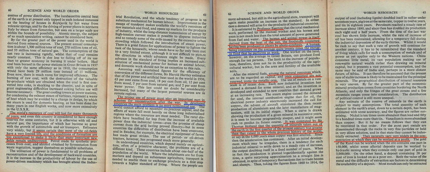 «Οι παγκόσμιοι πόροι άνθρακα θα διαρκέσουν για πολλές χιλιάδες χρόνια ... φαίνεται βέβαιο ότι τα περισσότερα πετρελαϊκά πεδία έχουν πολύ περιορισμένη διάρκεια ζωής και οι συνθήκες σχηματισμού τους είναι πολύ εξαιρετικές ώστε να είναι πιθανό ότι πολλά σημαντικά νέα πεδία θα παραμείνουν ανεξερεύνητα».