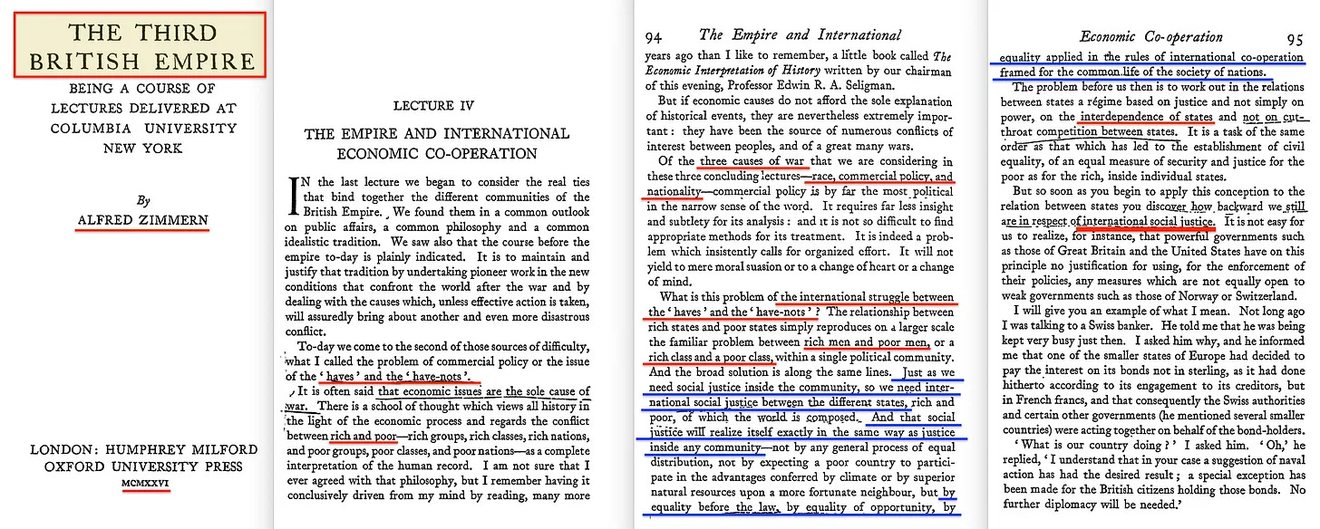 Κατά συνέπεια, τα πνευματικά θεμέλια της Τρίτης Βρετανικής Αυτοκρατορίας δεν τέθηκαν στα κυβερνητικά επιμελητήρια ή στις βασιλικές αυλές, αλλά σε ελίτ κύκλους στρατηγικής που προσπαθούσαν να υπερβούν τους περιορισμούς της παραδοσιακής κρατικής εξουσίας. Κεντρικό ρόλο σε αυτόν τον μετασχηματισμό διαδραμάτισαν προσωπικότητες όπως ο Alfred Zimmern [8] και ο Lionel Curtis [9] , οι οποίοι κατανόησαν ότι η εποχή της απροκάλυπτης αυτοκρατορίας τελείωνε - όχι επειδή η φιλοδοξία είχε μειωθεί, αλλά επειδή η λογική της έπρεπε να εξελιχθεί. Στο βιβλίο του The Third British Empire [10] (1926), ο Zimmern υποστήριξε ότι η βρετανική επιρροή θα έπρεπε να διατηρηθεί όχι μέσω του εδαφικού ελέγχου, αλλά με την ενσωμάτωση των κανόνων, του προσωπικού και της θεσμικής γραμματικής της στα αναδυόμενα συστήματα διεθνούς διακυβέρνησης. Το κρίσιμο είναι ότι διαμόρφωσε αυτή τη μεταμόρφωση ως ηθική προσπάθεια - ως υποχρέωση να καθοδηγήσει την παγκόσμια συνεργασία μέσω της εκπαίδευσης, της διοίκησης και του νόμου. Για τον Zimmern, το μέλλον της αυτοκρατορίας δεν ήταν η κατάκτηση, αλλά η συνείδηση: ένα εκπολιτιστικό σχέδιο που δικαιολογείται από τη διεθνή κοινωνική δικαιοσύνη, την ηθική ηγεσία και την υπόσχεση της παγκόσμιας ευημερίας. Αυτή η αλλαγή στη ρητορική - από την κυριαρχία στην υποτιθέμενη ευθύνη - βοήθησε στην αναδιατύπωση της αυτοκρατορικής στρατηγικής ως πεφωτισμένης διαχείρισης, προετοιμάζοντας έναν κόσμο στον οποίο η εξουσία θα μπορούσε να ασκείται αόρατα από την ελίτ.