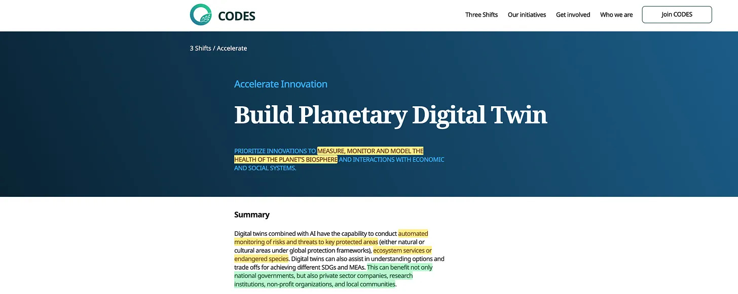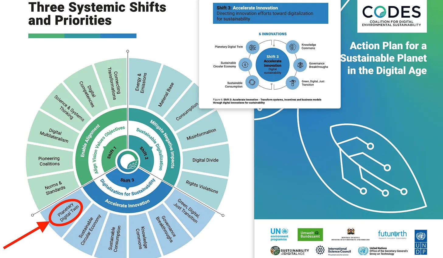 ... και το CODES μας καλεί να... «δημιουργήσουμε ένα ψηφιακό δίδυμο πλανήτη» [12] για να «μετρήσουμε, παρακολουθήσουμε και μοντελοποιήσουμε την υγεία της βιόσφαιρας του πλανήτη και τις αλληλεπιδράσεις με τα οικονομικά και κοινωνικά συστήματα».