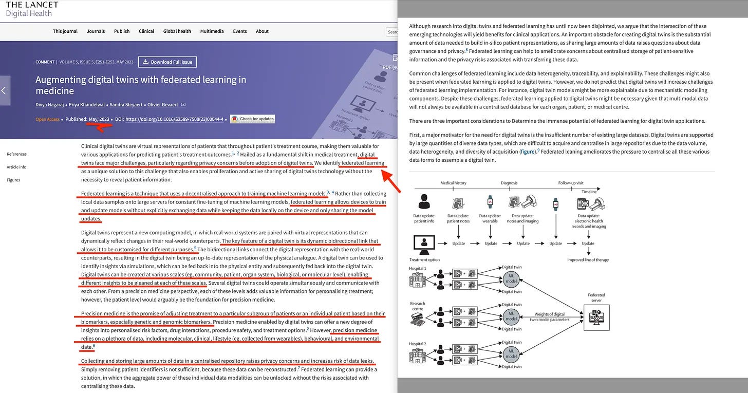 Όχι, ας επικεντρώσουμε τις προσπάθειές μας σε ένα τελικό έγγραφο, «Ενίσχυση των ψηφιακών δίδυμων με ομοσπονδιακή μάθηση στην ιατρική» [29], που δημοσιεύθηκε από το Lancet τον Μάιο του 2023. Σύντομα θα καταλάβουμε γιατί αυτό το έγγραφο είναι σημαντικό.
