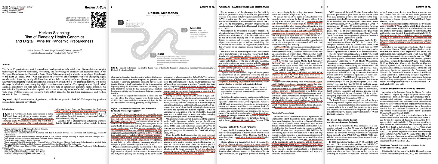 Το 2021 εκδόθηκε το έγγραφο «Horizon Scanning: Rise of Planetary Health Genomics and Digital Twins for Pandemic Preparedness» («Horizon Scanning: Η άνοδος της γονιδιωματικής της πλανητικής υγείας και των ψηφιακών διδύμων για την προετοιμασία ενάντια στις πανδημίες») [1], το οποίο περιγράφει όχι μόνο το υποτιθέμενο πρόβλημα της υποτιθέμενης πανδημίας, αλλά και την υποτιθέμενη λύση του.