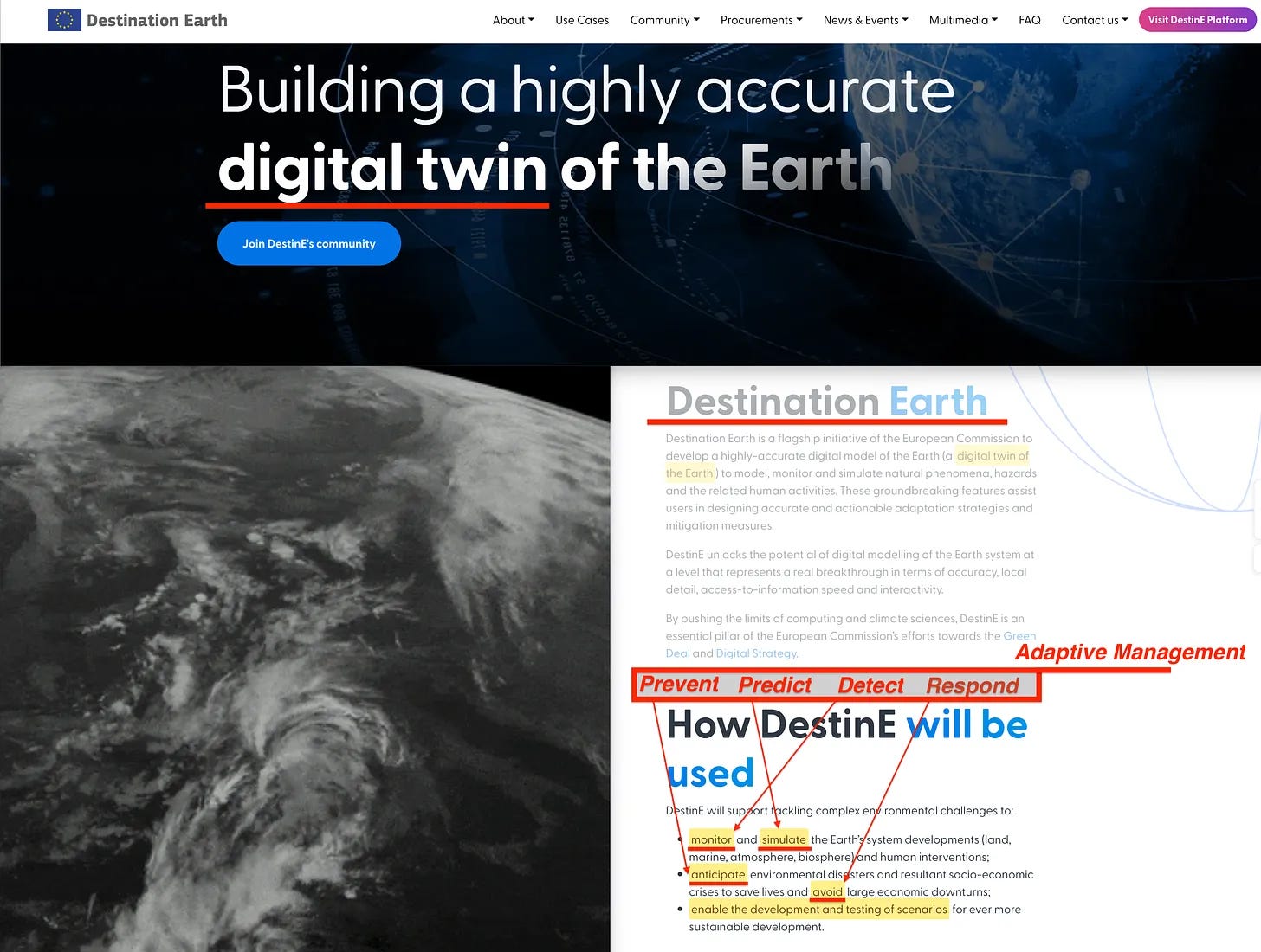 Ας ρίξουμε μια γρήγορη ματιά σε μια σειρά από άρθρα, καθώς δεν βλέπω ιδιαίτερη ανάγκη να εμβαθύνουμε. Όλα αυτά είναι προφανή, καθώς όλα ταιριάζουν απόλυτα, σαν γάντι. Πρώτον, έχουμε το DestinE [7], το οποίο υπόσχεται να δημιουργήσει ένα «εξαιρετικά ακριβές ψηφιακό δίδυμο της Γης»... πριν περιγράψει ένα πλαίσιο για «πρόβλεψη, παρακολούθηση, προσομοίωση, αποφυγή» που μοιάζει τόσο πολύ με το «Πρόληψη, Πρόβλεψη, Ανίχνευση, Αντίδραση» που θα πρέπει να είσαι αρκετά αμβλύς για να μην το δεις.