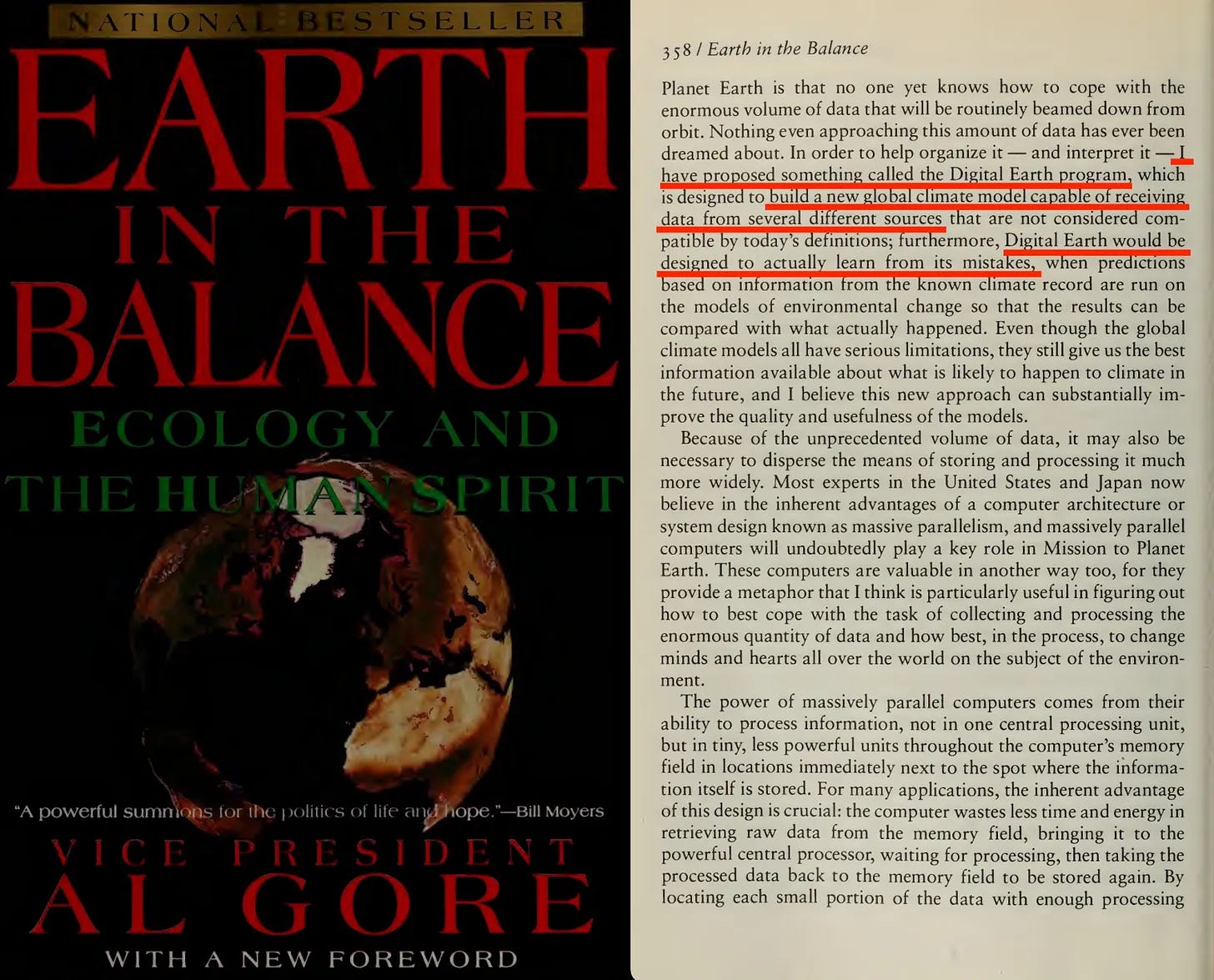 «... κανείς δεν ξέρει ακόμη πώς να αντιμετωπίσει τον τεράστιο όγκο δεδομένων που θα μεταδίδεται τακτικά από την τροχιά. Κανείς δεν έχει ονειρευτεί ποτέ κάτι που να πλησιάζει αυτόν τον όγκο δεδομένων. Προκειμένου να βοηθήσω στην οργάνωσή του — και στην ερμηνεία του — πρότεινα κάτι που ονομάζεται πρόγραμμα Digital Earth, το οποίο έχει σχεδιαστεί για να δημιουργήσει ένα νέο παγκόσμιο κλιματικό μοντέλο ικανό να λαμβάνει δεδομένα από διάφορες πηγές που δεν θεωρούνται συμβατές σύμφωνα με τους σημερινούς ορισμούς. Επιπλέον, το Digital Earth θα σχεδιαστεί έτσι ώστε να μαθαίνει από τα λάθη του, όταν οι προβλέψεις που βασίζονται σε πληροφορίες από τα γνωστά κλιματικά αρχεία εφαρμόζονται στα μοντέλα περιβαλλοντικής αλλαγής, έτσι ώστε τα αποτελέσματα να μπορούν να συγκριθούν με αυτά που συνέβησαν στην πραγματικότητα».