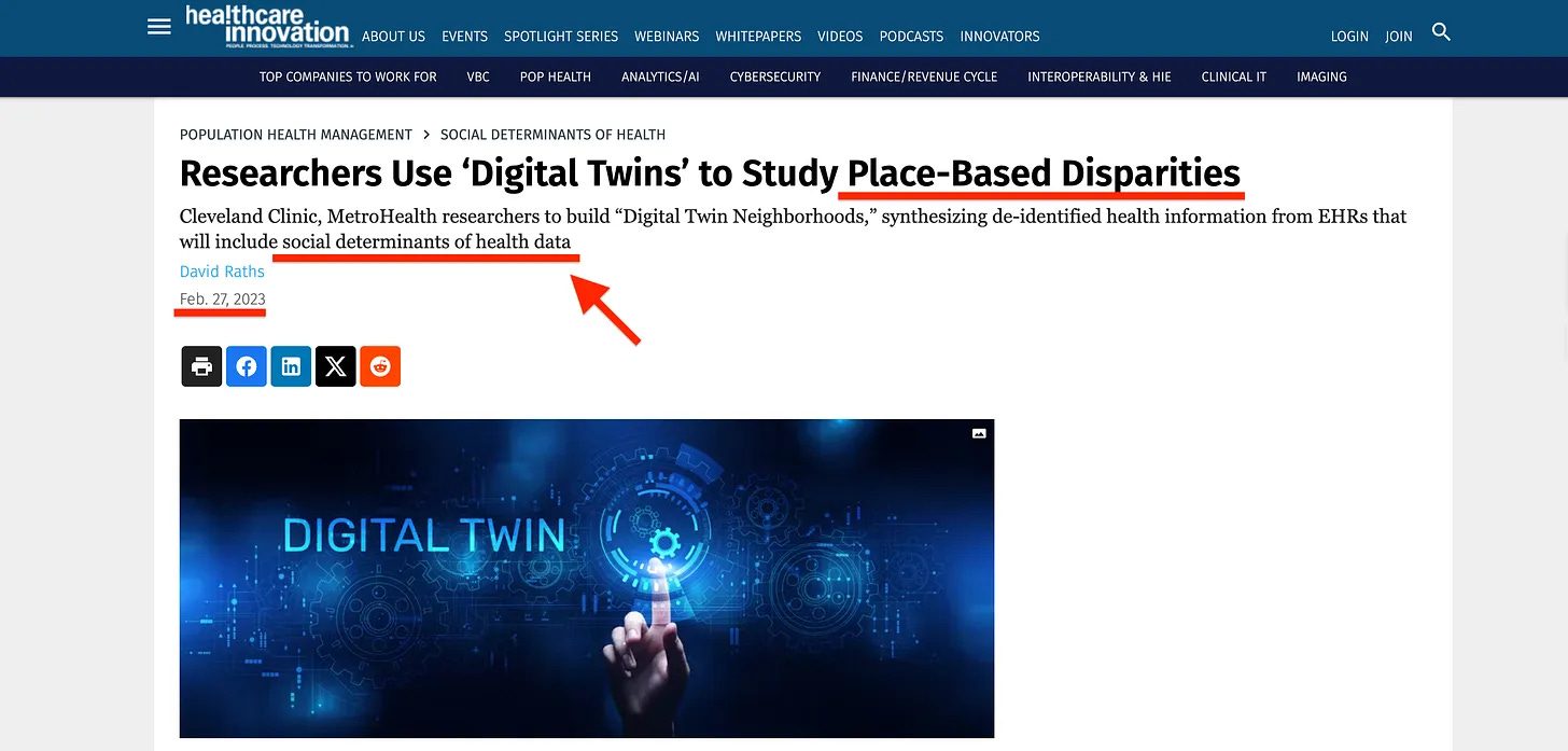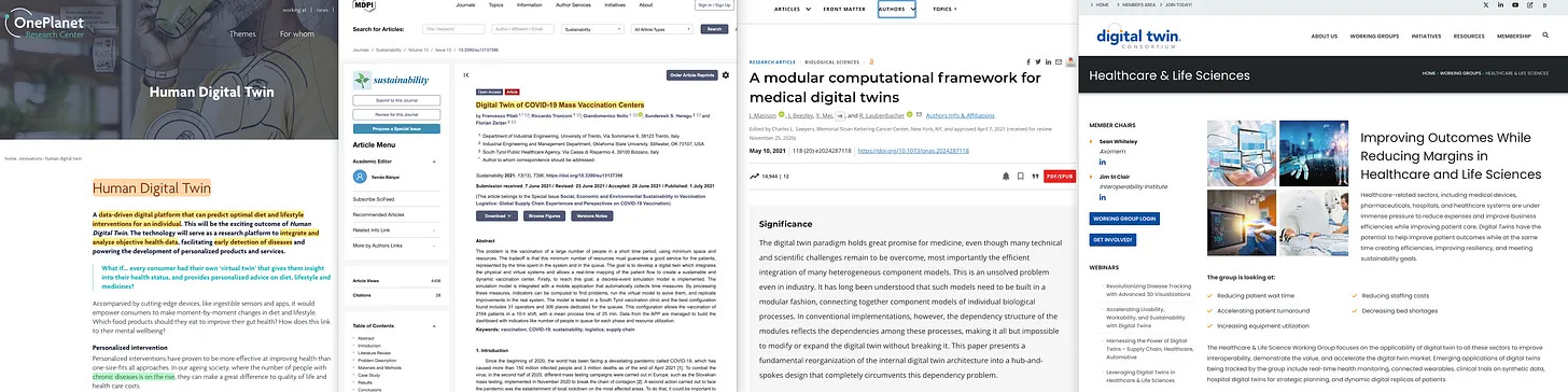 Και υπάρχουν τόσα πολλά από αυτά, που θα επιταχύνω αυτή τη διαδικασία, επειδή υπάρχουν μερικά άρθρα που αξίζουν πιο προσεκτική εξέταση. Πρώτα έχουμε μια σελίδα από το «One Planet Research Centre» [24], έχουμε (δεν αστειεύομαι) «Ψηφιακό Δίδυμο των Κέντρων Μαζικών Εμβολιασμών COVID-19» [25], «Ένα αρθρωτό υπολογιστικό πλαίσιο για ιατρικά ψηφιακά δίδυμα» [26], και ακόμη και ένα Ψηφιακό Δίδυμο Consortium [27]! Υπάρχει επίσης ένα «έγγραφο προβληματισμού» του WEF με θέμα «Ένα όραμα για το μέλλον: Μετασχηματίζοντας τα συστήματα υγείας» [28].