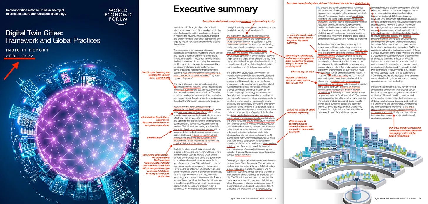 Και δεδομένου ότι εμπλέκεται ο ιδιωτικός τομέας, αυτό απαιτεί προφανώς τη συμμετοχή του Παγκόσμιου Οικονομικού Φόρουμ. Ακολουθεί η έκθεση του 2022 με τίτλο «Ψηφιακές δίδυμες πόλεις: Πλαίσιο και παγκόσμιες πρακτικές» [16].