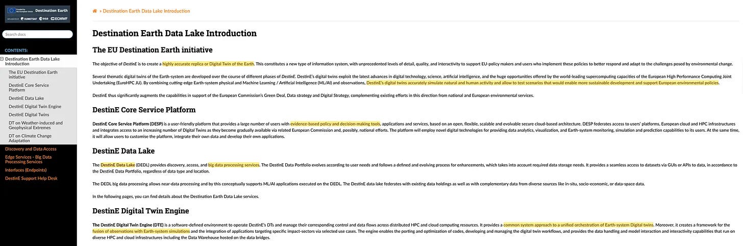 Διαθέτουν επίσης ένα «Data Lake» [8], το οποίο ουσιαστικά είναι το οικοσύστημά τους που επιτρέπει μια «κοινή προσέγγιση συστήματος για μια ενοποιημένη ενορχήστρωση των ψηφιακών δίδυμων του συστήματος της Γης» μέσω της δημιουργίας μιας «σύντηξης παρατηρήσεων με προσομοιώσεις του συστήματος της Γης», η οποία σε συνδυασμό με «υπηρεσίες επεξεργασίας μεγάλων δεδομένων» θα οδηγήσει τελικά σε «εργαλεία χάραξης πολιτικής και λήψης αποφάσεων βάσει τεκμηρίων» με απώτερο στόχο την «ενίσχυση της βιώσιμης ανάπτυξης».