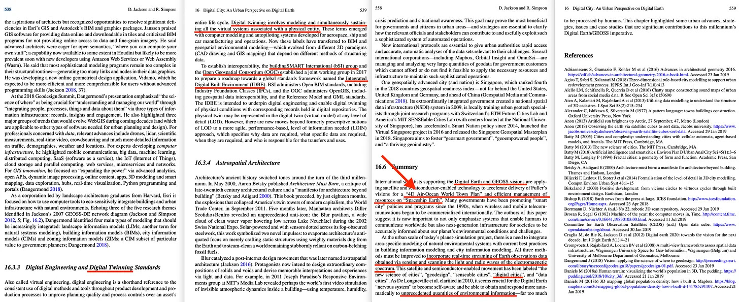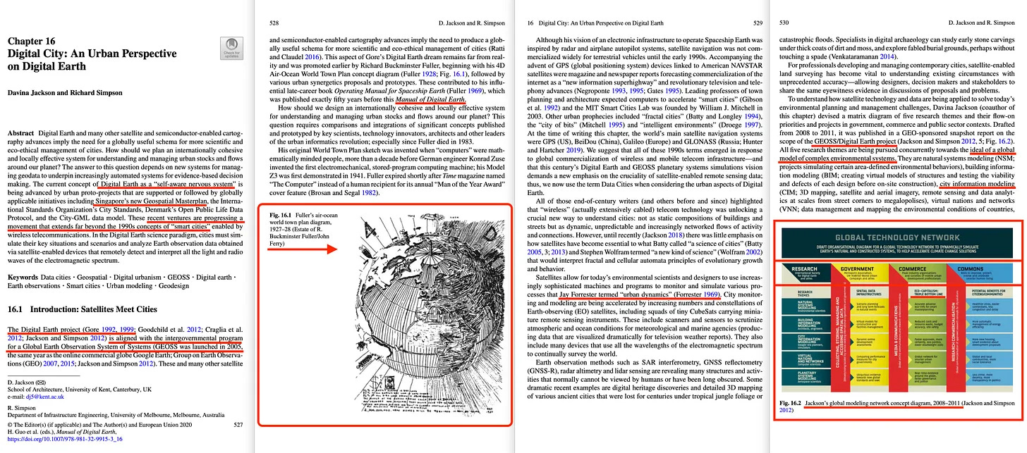 Τέλος πάντων, θα κλείσω με μερικά άλλα ενδιαφέροντα σημεία. Πρώτον, εδώ είναι η Davina Jackson και ο Richard Simpson από το 2020: «Digital City: An Urban Perspective on Digital Earth» (Ψηφιακή πόλη: Μια αστική προοπτική για την ψηφιακή Γη) [31], που συνδέει ρητά το GEOSS με το όραμα του Buckminster Fuller από το 1927-28!...