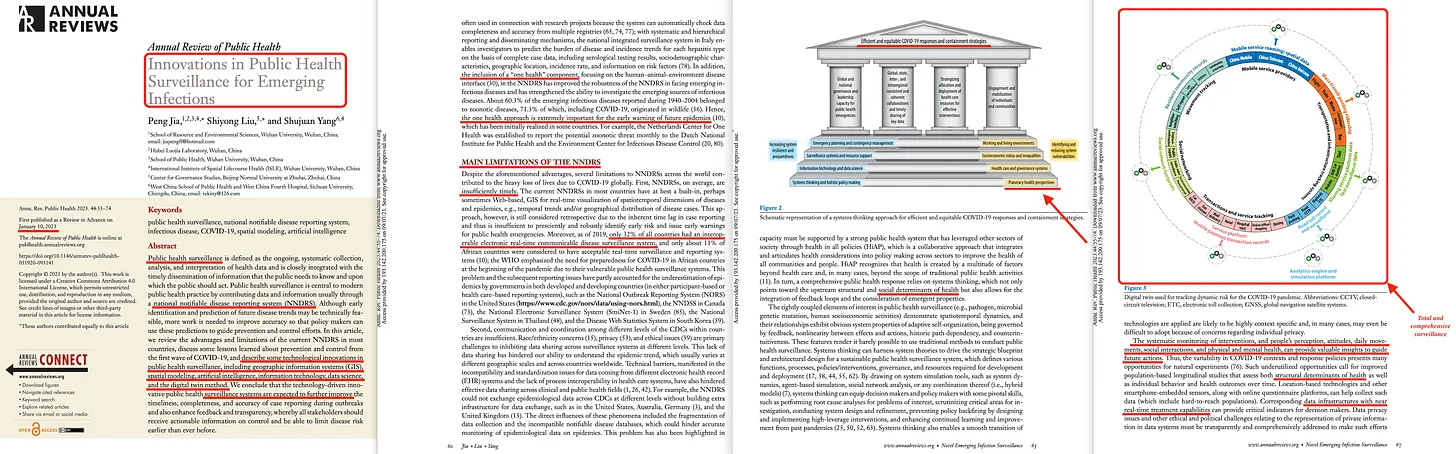 Κατά συνέπεια, αυτό που απαιτείται είναι πολλά δεδομένα επιτήρησης, παντού. Και στις αρχές του 2023, δημοσιεύθηκε ένα άρθρο από το Wuhan, με τίτλο «Καινοτομίες στην επιτήρηση της δημόσιας υγείας για αναδυόμενες λοιμώξεις» [19]. Και παρόλο που το άρθρο είναι ένα από τα χειρότερα που έχω διαβάσει για το θέμα, δεν βλέπω κανένα λόγο να το καλύψω λεπτομερώς, επειδή η υπόθεση είναι τόσο προφανής και ξεκάθαρη -
