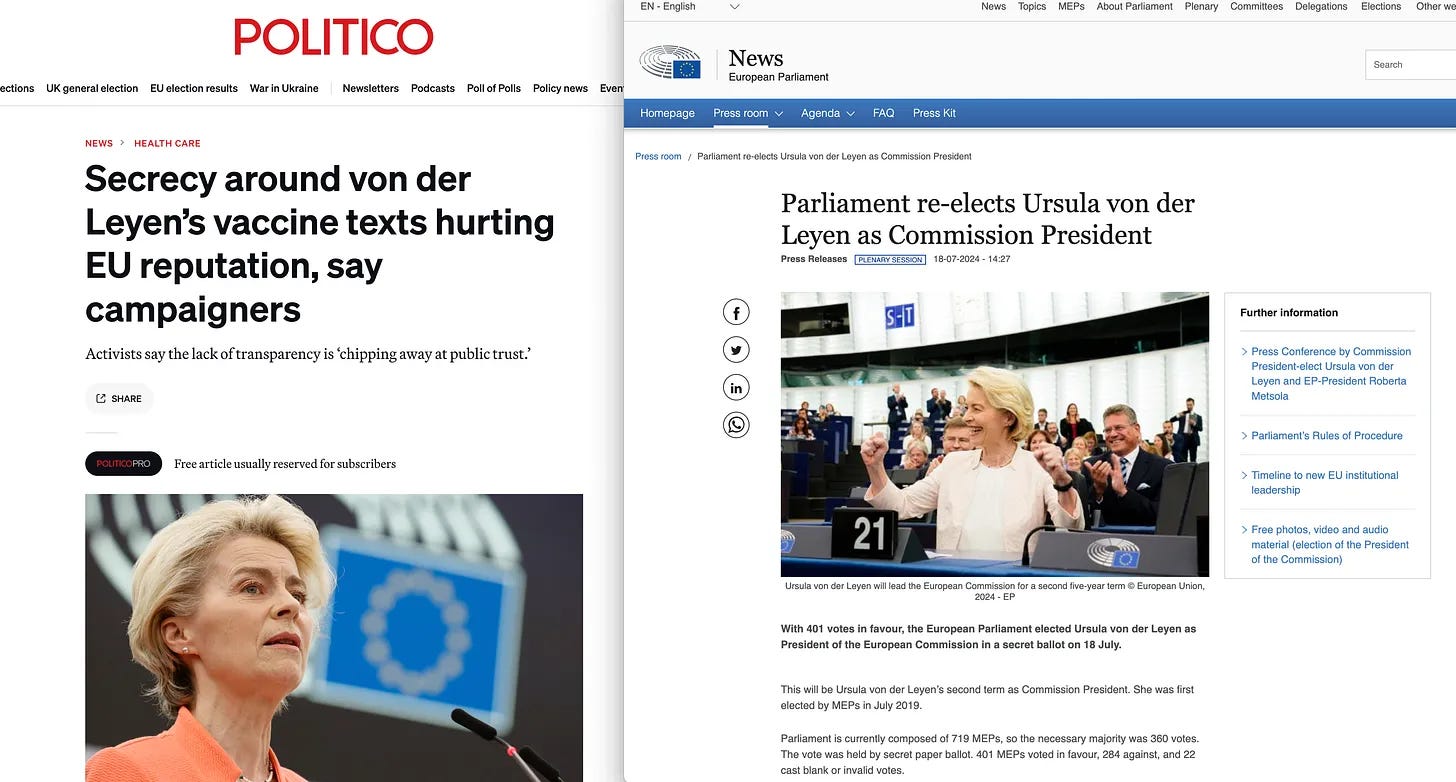 Δεν έχει σημασία ότι δεν ρώτησαν κανέναν αν το ήθελε αυτό. Δεν έχει σημασία ότι εργάζονταν πάνω σε αυτό για χρόνια πριν από την κυκλοφορία αυτού του εγγράφου. Δεν έχει σημασία ότι προωθήθηκε από ψεύτες, που διαφημίζουν υποσχέσεις για «καλή διακυβέρνηση», «διαφάνεια» και «λογοδοσία», όχι μόνο δεν βλέπουν κανένα πρόβλημα στο γεγονός ότι η υποτιθέμενη «πρόεδρος» καταστρέφει ενεργά πληροφορίες [2] σχετικά με μηνύματα κειμένου μεταξύ αυτής και του διευθύνοντος συμβούλου της Pfizer, Albert Bourla, αλλά, στην πραγματικότητα, οι ευρωβουλευτές αποφασίζουν ότι όχι μόνο αυτό δεν αποτελεί επαρκή απόδειξη για την απομάκρυνσή της (πόσο μάλλον για τη δίωξή της), αλλά αποφασίζουν να την επανεκλέξουν λίγο μετά [3].