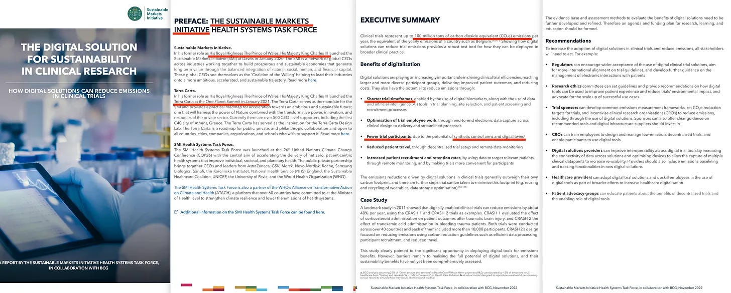 Στη συνέχεια, έχουμε ένα έγγραφο του 2022, ευγενική προσφορά της Πρωτοβουλίας για Βιώσιμες Αγορές του Πρίγκιπα Κάρολου, με τίτλο «Η ψηφιακή λύση για τη βιωσιμότητα στην κλινική έρευνα» [22].