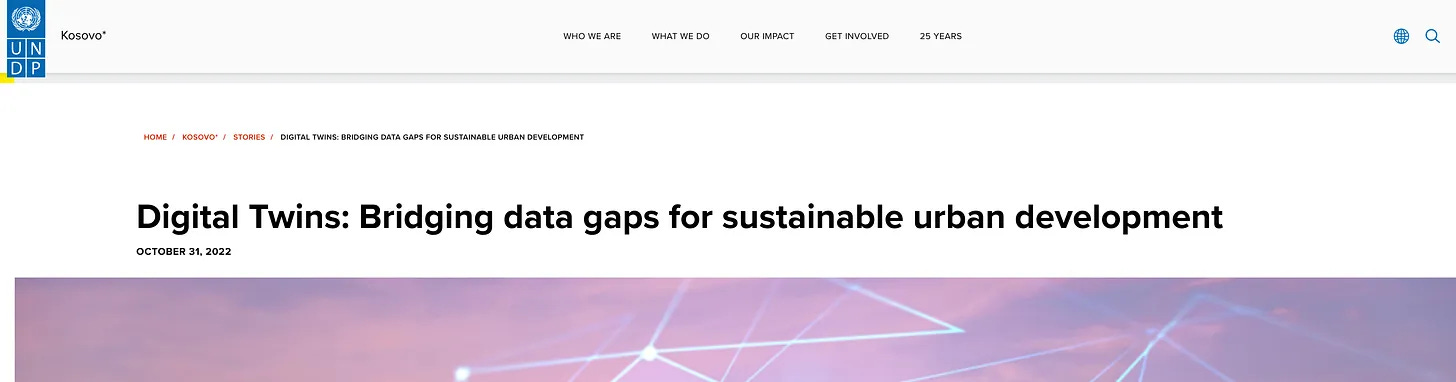 Αλλά τα Ηνωμένα Έθνη βρίσκουν και άλλους τομείς όπου αυτό θα μπορούσε να είναι χρήσιμο. Εδώ είναι η έκθεση του Οκτωβρίου 2022 του UNDP - «Ψηφιακοί Δίδυμοι: Γεφυρώνοντας τα κενά στα δεδομένα για βιώσιμη αστική ανάπτυξη» [14].