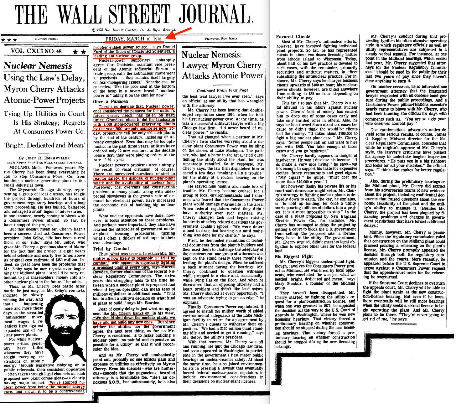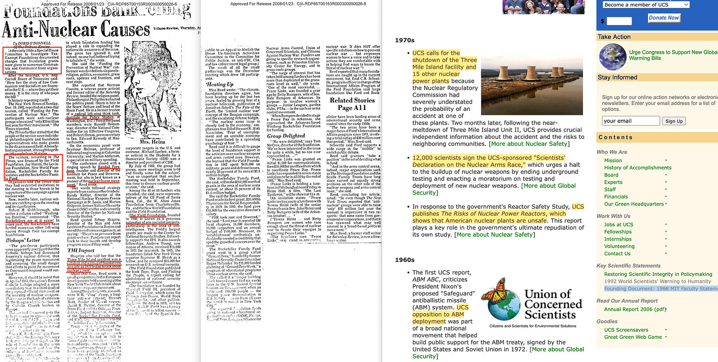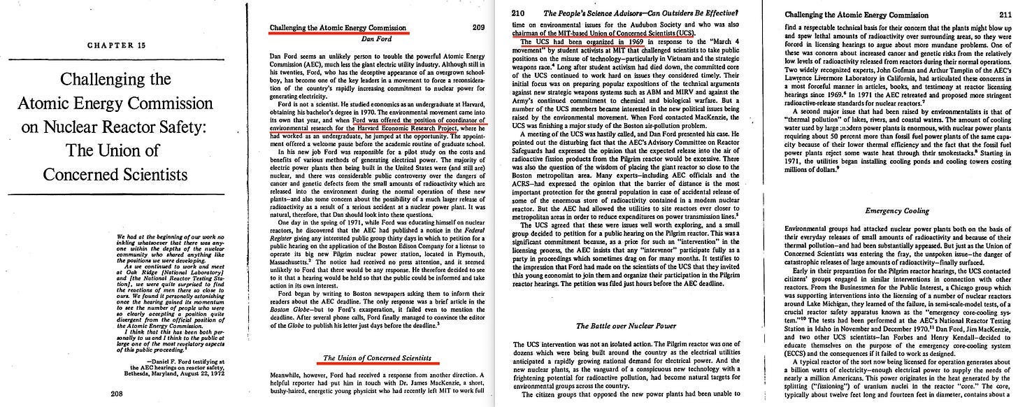 Και όσον αφορά την UCS που ισχυρίζεται ότι είναι «υπέρ» της πυρηνικής ενέργειας σε σύγχρονα περιβάλλοντα- με την ευγενική χορηγία της Wall Street Journal, και το 1978 - «’Σταματήσαμε την πυρηνική ενέργεια από το να είναι η θαυματουργή ενεργειακή θεραπεία, και δείξαμε ότι είναι μια αμφιλεγόμενη, γεμάτη προβλήματα πηγή ενέργειας’‘, λέει ο Daniel Ford της Ένωσης Ανήσυχων Επιστημόνων, μιας κορυφαίας αντιπυρηνικής ομάδας» [22].
