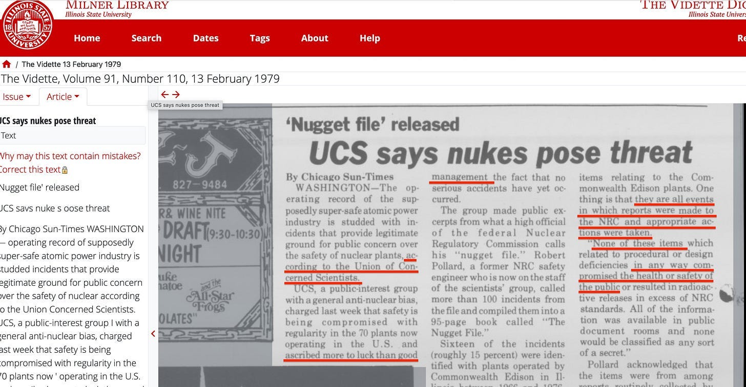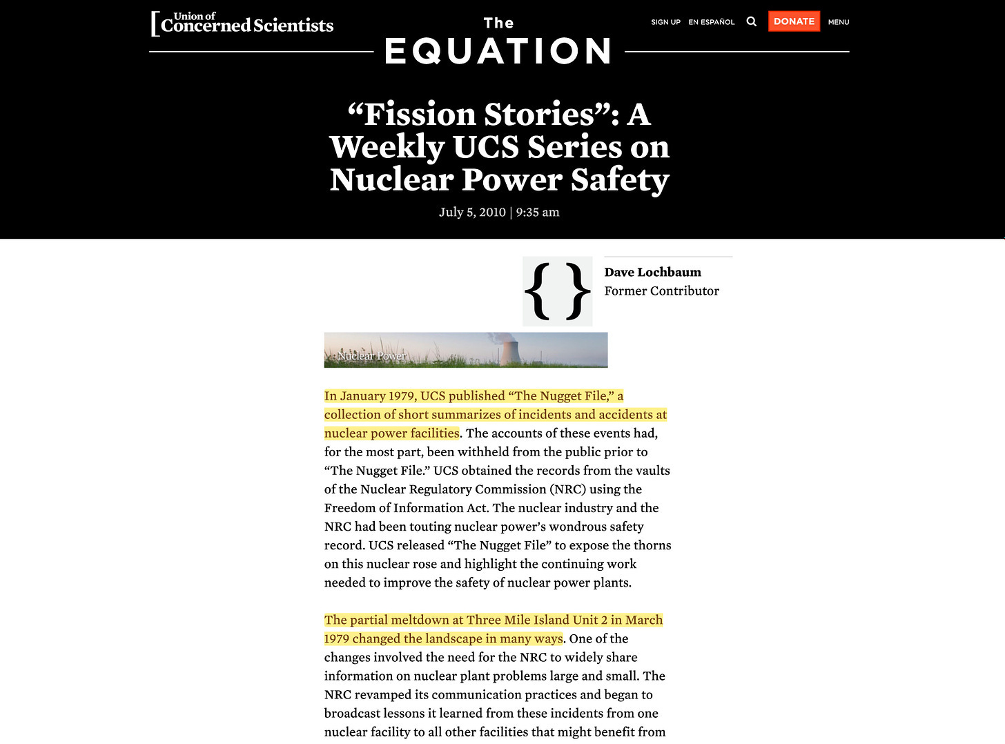Η UCS το 1979 [18] - αμέσως πριν από το Three Mile Island - κυκλοφόρησε ένα «αρχείο ψήγματος», γεμάτο από άσχετα σε μεγάλο βαθμό πράγματα που σχετίζονται με την πυρηνική βιομηχανία στις Ηνωμένες Πολιτείες, δημιουργώντας το εξαιρετικά απίθανο χρονοδιάγραμμα που βλέπουμε παρακάτω -
