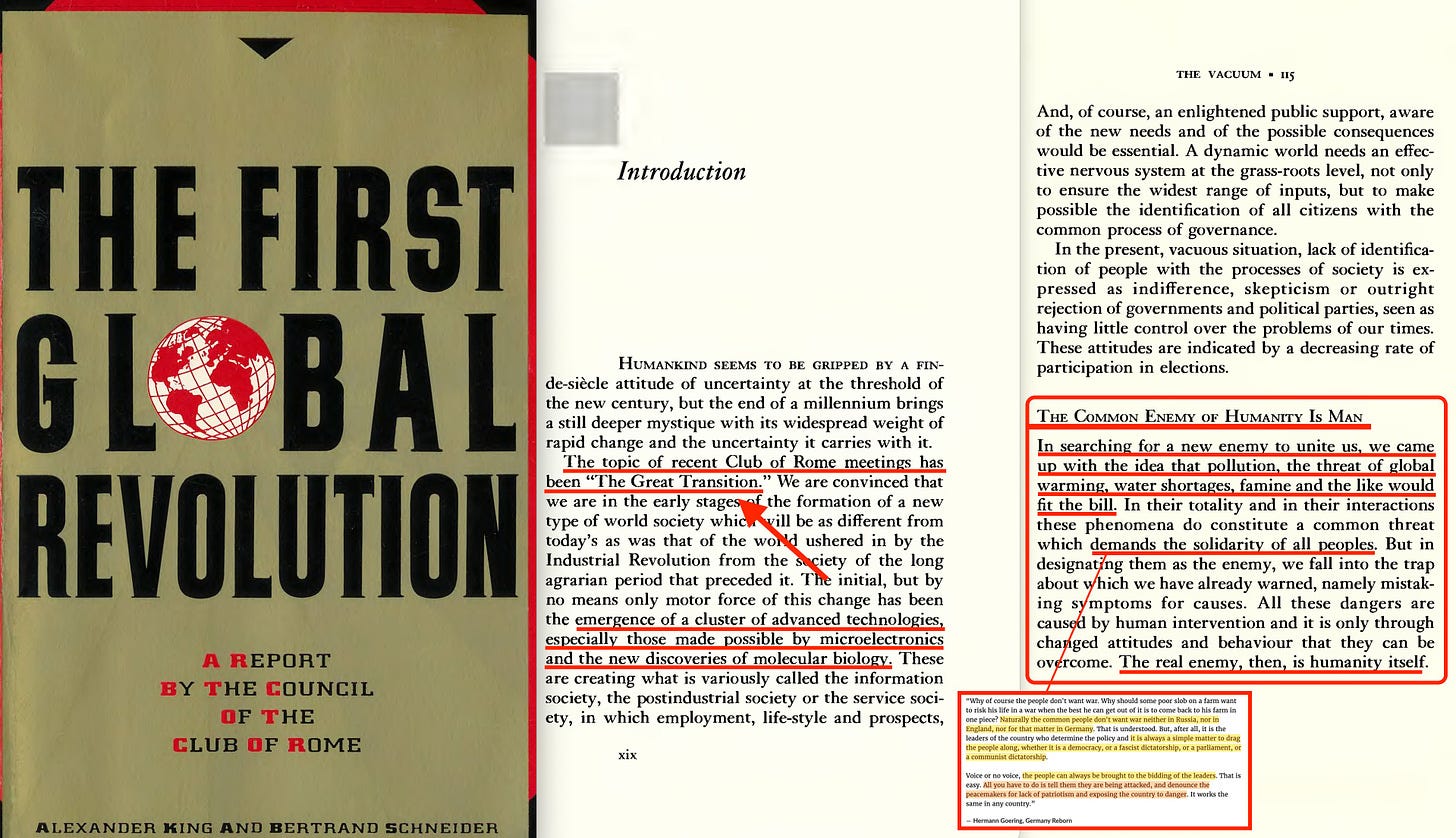 «Αναζητώντας έναν νέο εχθρό που θα μας ενώσει, καταλήξαμε στην ιδέα ότι η ρύπανση, η απειλή της υπερθέρμανσης του πλανήτη, η λειψυδρία, η πείνα και τα παρόμοια θα ταίριαζαν... απαιτεί την αλληλεγγύη όλων των λαών... μπερδεύοντας τα συμπτώματα με τις αιτίες. Όλοι αυτοί οι κίνδυνοι προκαλούνται από την ανθρώπινη παρέμβαση και μόνο με την αλλαγή στάσεων και συμπεριφορών μπορούν να ξεπεραστούν. Ο πραγματικός εχθρός, λοιπόν, είναι η ίδια η ανθρωπότητα».