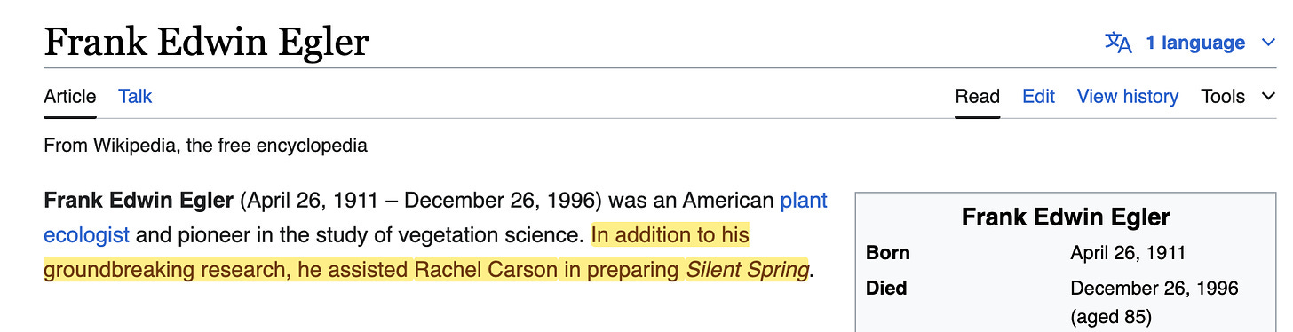 Και αυτό είναι στην πραγματικότητα εντυπωσιακά χειριστικό, διότι ο Egler συνεργάστηκε με την Carsons στο εν λόγω βιβλίο [5]. Κατά συνέπεια, πρόκειται για αυτοαναφορά.