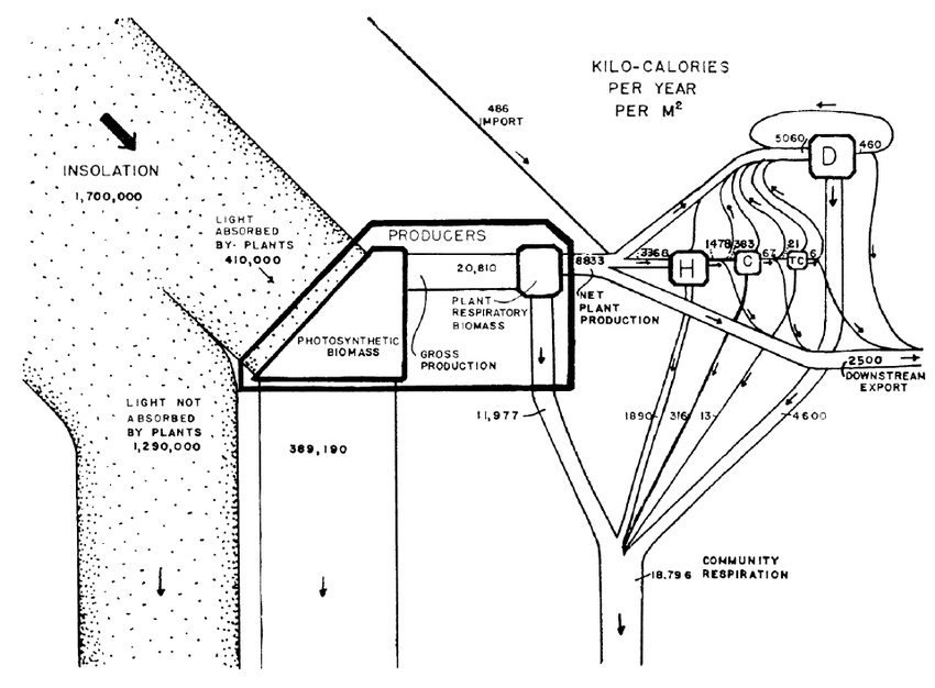 Και τέλος, η Οικολογία Συστημάτων (HT Odum) εισήγαγε την κάπως απλουστευμένη έννοια της κυκλοφορίας της ενέργειας σε ένα δεδομένο σύστημα. Αυτό επέτρεψε έναν φυσικό ενεργειακό παραλληλισμό με το ισοδύναμο ηλεκτρικών κυκλωμάτων που παρατηρήθηκε στα Σιωπηλά Όπλα για Ήσυχους Πολέμους που συζητήθηκαν προηγουμένως. Και όταν αυτά τα δύο συνδυάζονται, επιτρέπουν την εννοιολογική ευθυγράμμιση μεταξύ της φυσικής ενέργειας και της κοινωνικής ενέργειας - δηλαδή, χρήματα που υποστηρίζονται από μια πηγή φυσικής ενέργειας - ή αν πρέπει να την ευθυγραμμίσουμε με την αρνητική της, αυτό θα μπορούσε να συμβεί μέσω των αδειών εκπομπής διοξειδίου του άνθρακα.
