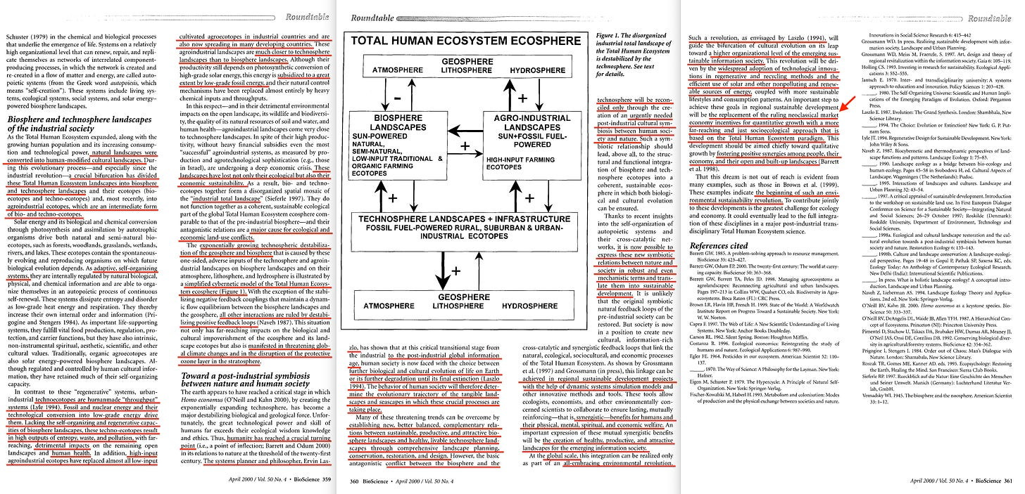 «Ως αποτέλεσμα, οι βιο- και τεχνο-οικοτόποι μαζί σχηματίζουν ένα αποδιοργανωμένο χωρικό μωσαϊκό του «βιομηχανικού ολικού τοπίου»... οι ανταγωνιστικές τους σχέσεις είναι μια σημαντική αιτία για τις οικολογικές και οικονομικές συγκρούσεις μεταξύ των χρήσεων γης».