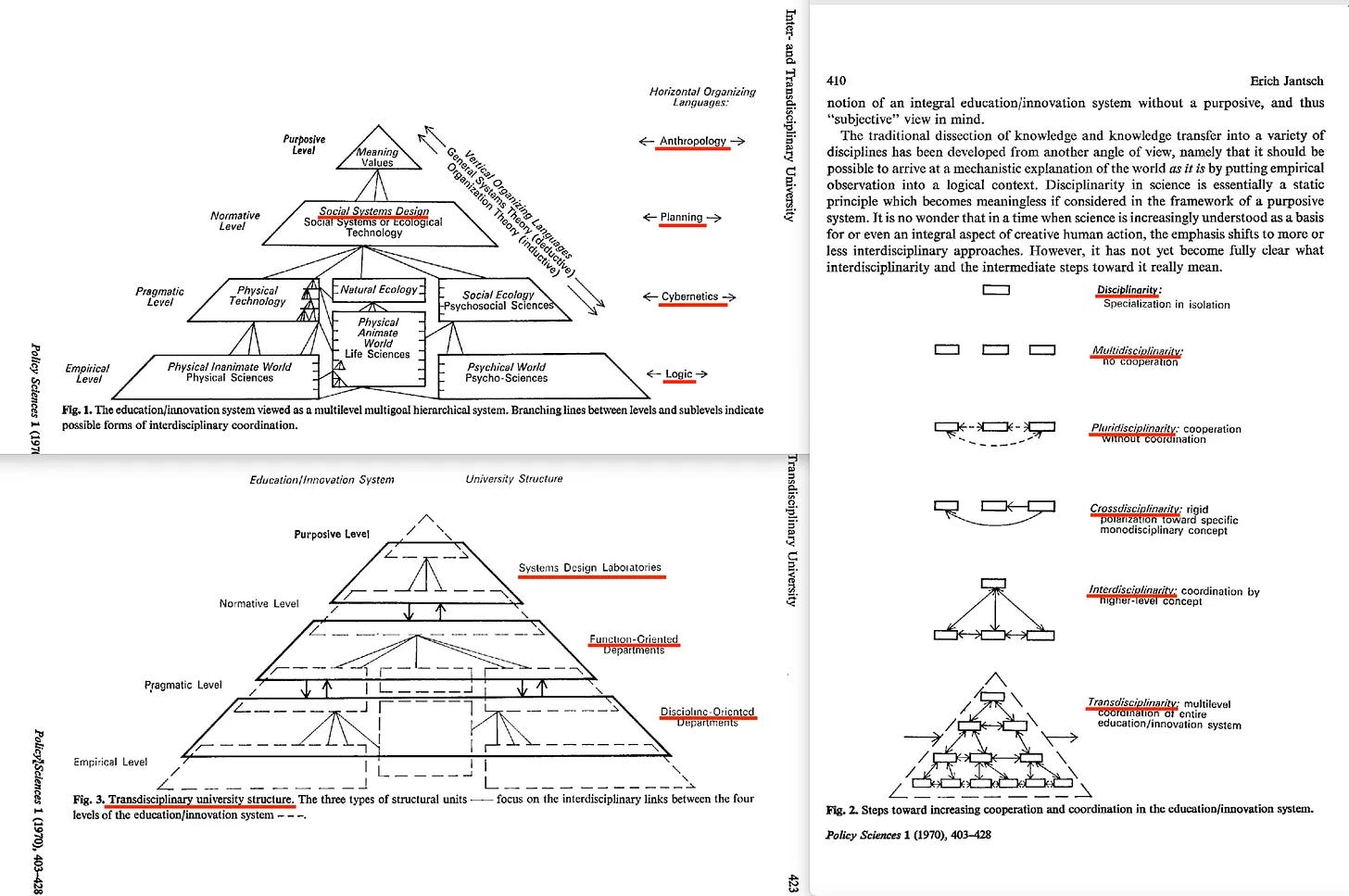Η αναφερόμενη ιεραρχική συστημική θεώρηση μπορεί να βρεθεί στην εργασία του Jantsch, «Inter- and Transdisciplinary University: A Systems Approach to Education and Innowation» (Δια- και διεπιστημονικό πανεπιστήμιο: Μια συστημική προσέγγιση της εκπαίδευσης και της μόρφωσης) [3], και είναι αρκετά κατατοπιστική - όχι μόνο επειδή ξεκαθαρίζει τις παρεξηγήσεις που μπορεί να τρέφει κανείς σχετικά με την “επιστημονικότητα” και τον τρόπο με τον οποίο αυτές σχετίζονται, αλλά και επειδή περιγράφει με σαφήνεια τα τέσσερα ιεραρχικά επίπεδα: εμπειρικό, πραγματιστικό, κανονιστικό και σκόπιμο, και πώς αυτά μεταφράζονται στις «γλώσσες» της λογικής, της κυβερνητικής, του σχεδιασμού και της ανθρωπολογίας. Και εξηγεί περαιτέρω την ενσωμάτωση αυτών των επιπέδων καθώς το Πανεπιστήμιο δομεί: τμήματα προσανατολισμένα σε επιστημονικούς κλάδους, τμήματα προσανατολισμένα σε λειτουργίες και εργαστήρια σχεδιασμού συστημάτων.