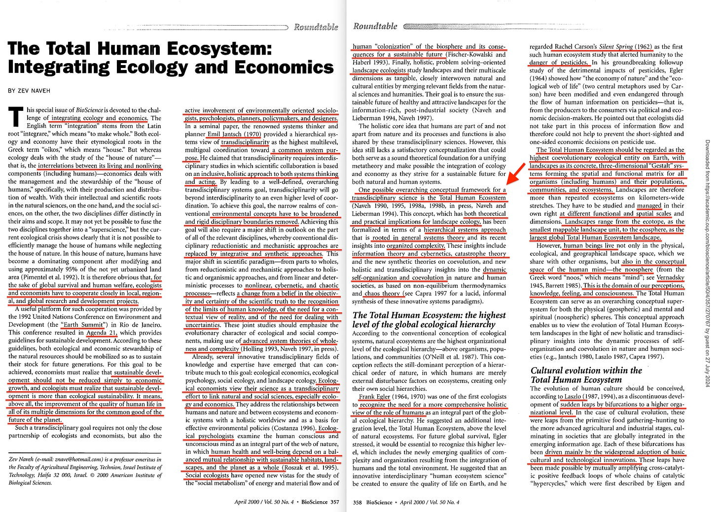 «Αυτές οι κοινές μελέτες θα πρέπει να δίνουν έμφαση στον εξελικτικό χαρακτήρα των οικολογικών και κοινωνικών συνιστωσών, κάνοντας χρήση των προηγμένων συστημικών θεωριών της ολότητας και της πολυπλοκότητας (Holling 1993, Naveh 1997, υπό έκδοση)».