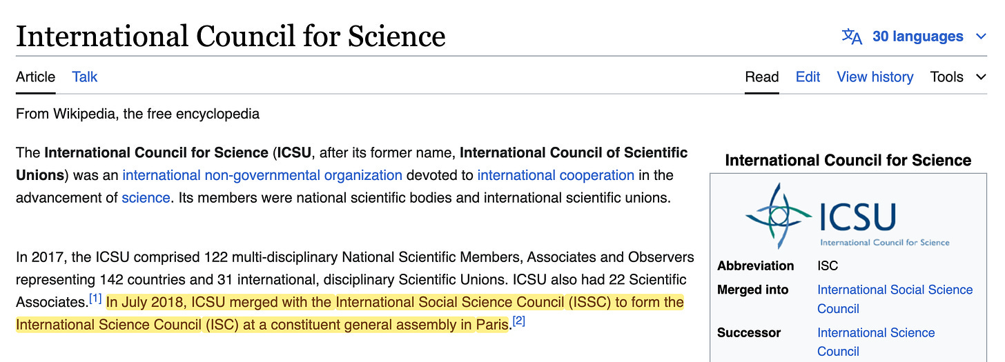 ... προκειμένου να επιλυθεί η σύγχρονη κρίση, οι φυσικές και οι κοινωνικές επιστήμες πρέπει να συγχωνευθούν. Και κατά εξαιρετική σύμπτωση, το Διεθνές Συμβούλιο Επιστημονικών Ενώσεων και το Διεθνές Συμβούλιο Κοινωνικών Επιστημών συγχωνεύτηκαν το 2018 [2], δημιουργώντας το Διεθνές Συμβούλιο Επιστημών.