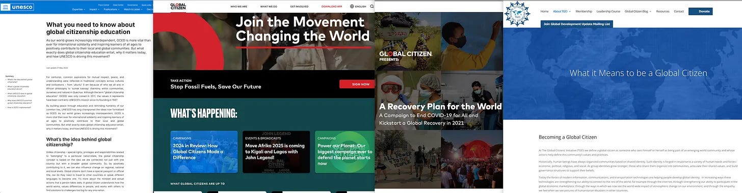 Ωχ, από πού να αρχίσω. Έχουμε την πρωτοβουλία της UNESCO για την Εκπαίδευση των Παγκόσμιων Πολιτών [2], έχουμε την εντελώς λαϊκή και σίγουρα όχι ψεύτικη «Global Citizen Dot Org» [3], η οποία εντυπωσιακά συνέταξε ακόμη και μια έκθεση 46 σελίδων με τίτλο «Covid-19 Recovery» [4], μια σίγουρα όχι ιδρυματική «Global Citizen Foundation» [5], μια σίγουρα όχι ψεύτικη «Global Citizens Initiative» [6]... Εννοώ, παιδιά... ελάτε τώρα. Αυτό είναι ερασιτεχνικό. Πρέπει να δημιουργήσεις μια μικρή πρόκληση, να επινοήσεις τη δική σου ψεύτικη ορολογία και στη συνέχεια να ντύσεις τους ορισμούς της με ανέντιμη Αισωπική γλώσσα. Δεν σου το έμαθε αυτό ο μαρξιστής καθηγητής σου στο πανεπιστήμιο; Είναι πρακτικά το Α’ μάθημα για κάθε λογικό κομμουνιστή καθηγητή στα τμήματα κοινωνικών επιστημών. Όσο για όλες αυτές τις ιστοσελίδες... κοίτα, όλοι προωθείτε ακριβώς τα ίδια πράγματα. Είναι τόσο προφανώς ψεύτικο.